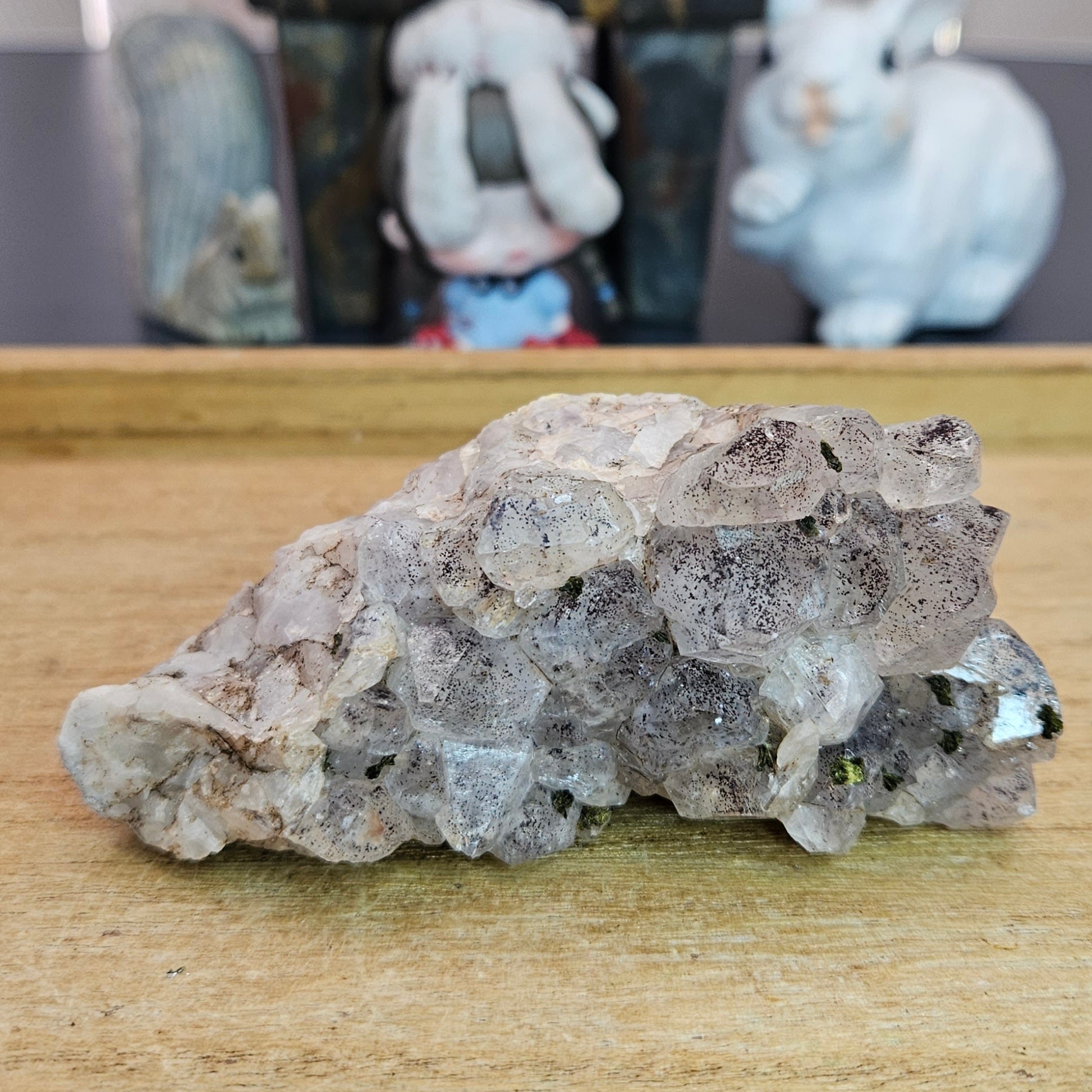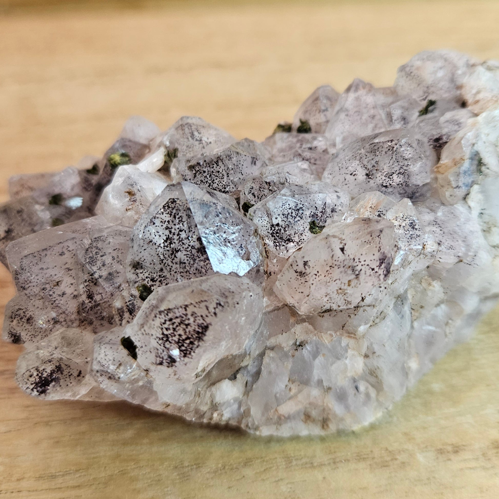 This Amethyst cluster features natural inclusions and phantoms, making it a unique and eye-catching addition to any collection. The natural inclusions add depth and character to the piece, while the phantoms give a glimpse into the crystal's formation process. Perfect for any crystal enthusiast this cluster contains natural mineral inclusions, such as iron oxide minerals like goethite and hematite, which form during the crystal's growth and give it darker spots, sometimes appearing as dark needles, Phantoms or sprays, adding to its unique character. This piece also has small growths of epidote which add to its uniqueness.