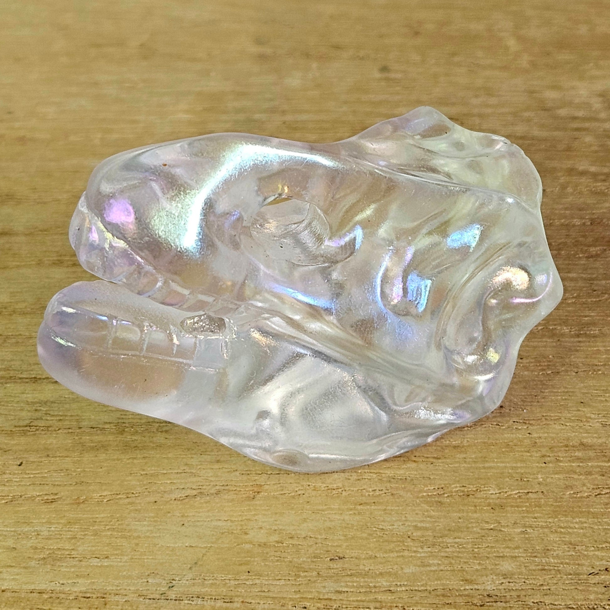 Turn your home into a prehistoric paradise with the Aura Glass T-Rex Skull Carving. This unique glass ornament features a trex skull shape and a bright aura coating for a playful touch. Add a touch of fun and quirk to your decor with this one of a kind piece. A fun fact about aura-coated crystals is that their vibrant, iridescent colors are not found in nature but are created by fusing precious metals like platinum, gold, and titanium to natural crystals in a vacuum deposition process.