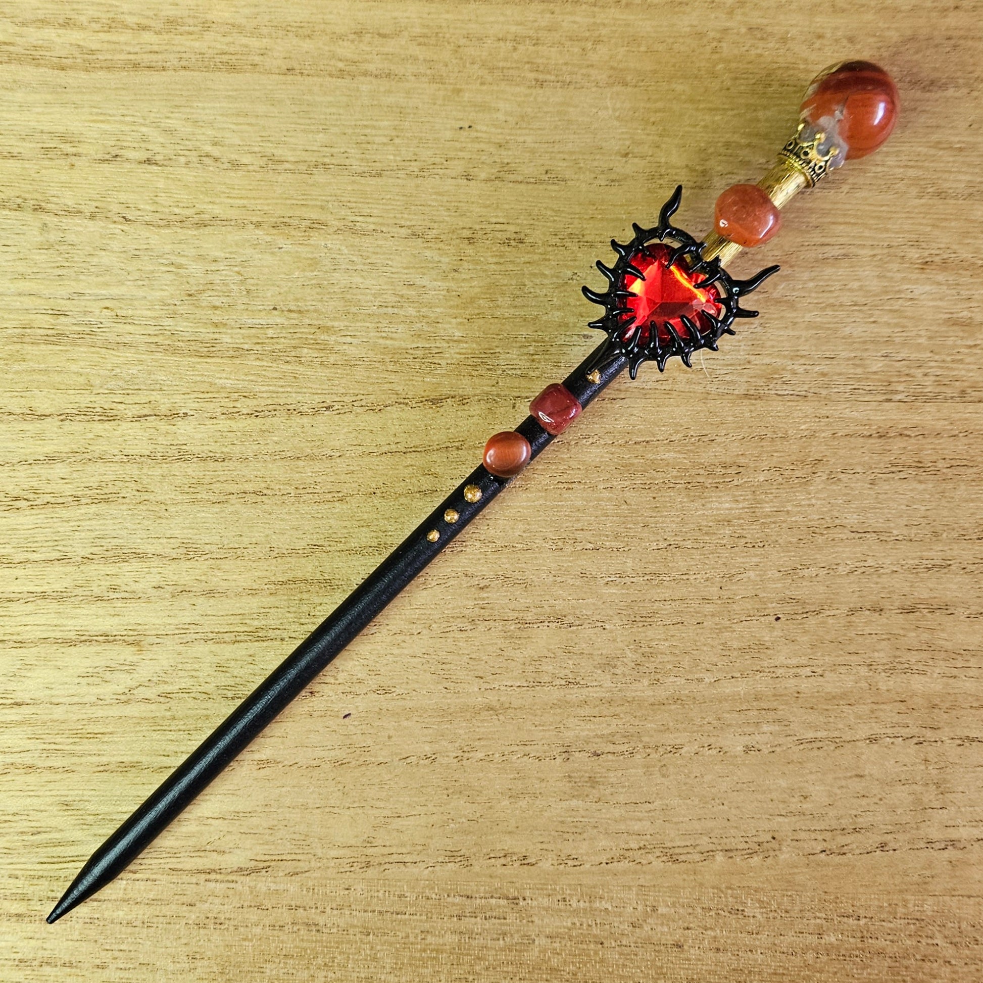 Discover the beauty and power of our Black & Gold Spiked Heart Wand. Expertly handcrafted with an Red Jasper sphere atop a silver crown, adorned with a striking black and red heart charm. Decorated with hand selected red jasper chips and made with uv resin for long-lasting durability. This wand is perfect for those seeking a touch of magic in their lives & home decor.