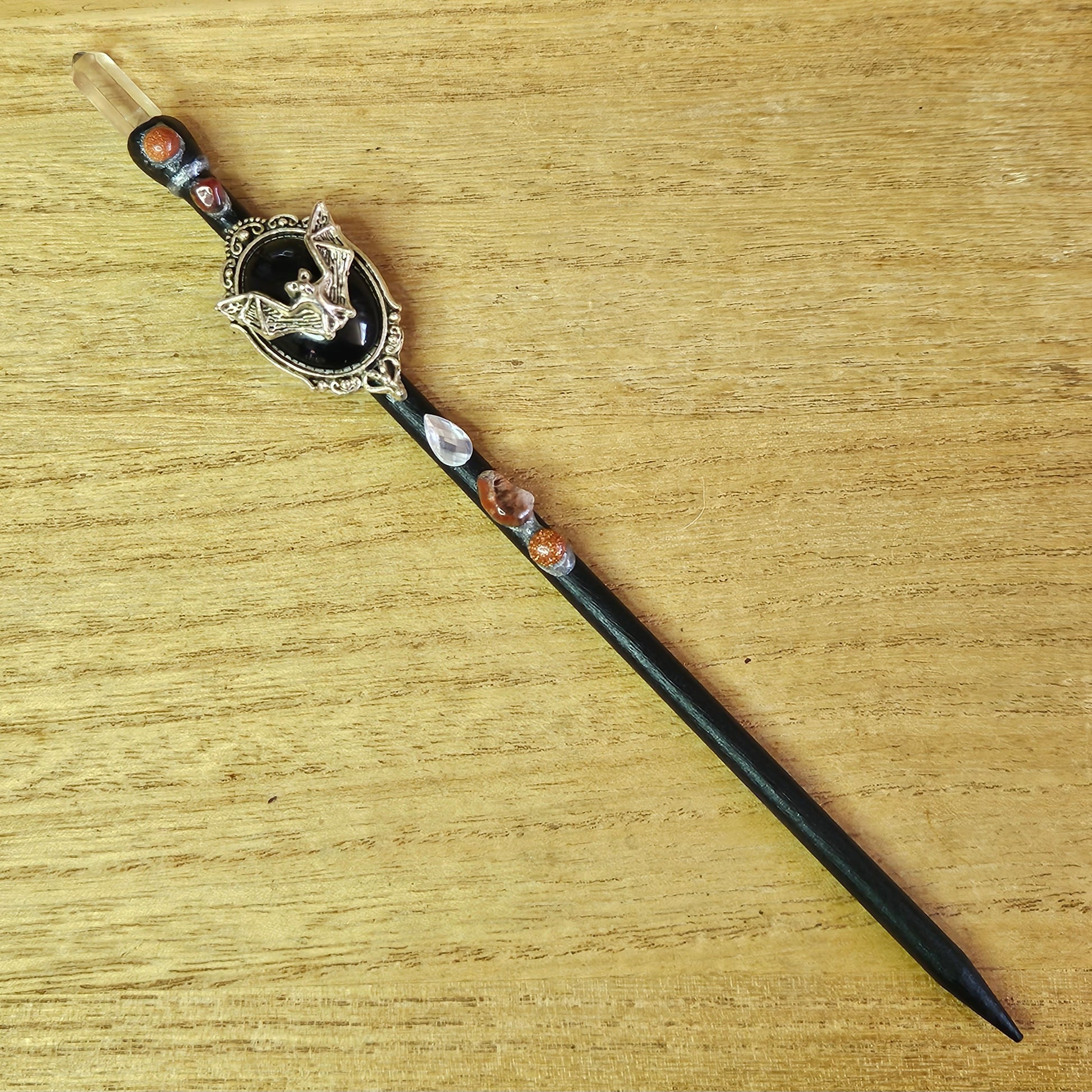 This handmade Black Bat Wand features a black and silver bat charm, a Clear Quartz point, gold sandstone & Amethyst with inclusions chips. Made with uv resin for long-lasting durability. Unleash your inner witch with a touch of whimsy, perfect for spell casting, cosplay or as a unique addition to your collection.