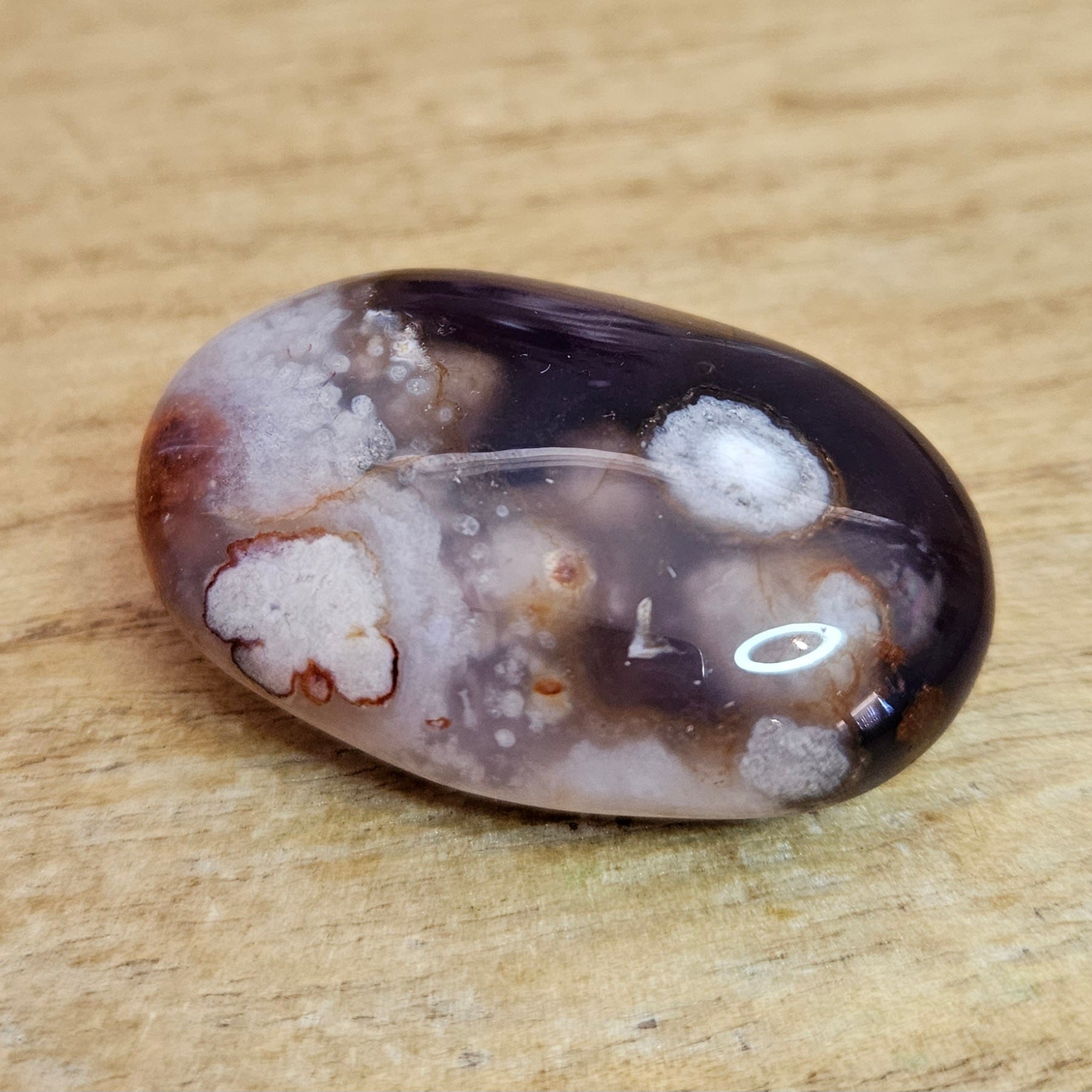 This polished natural black flower agate palmstone is a beautiful addition to any crystal collection. Its unique flower patterns and inclusions make it a stunning piece to admire. Take it outside and watch as it catches the sunlight, revealing a gorgeous purple tone.