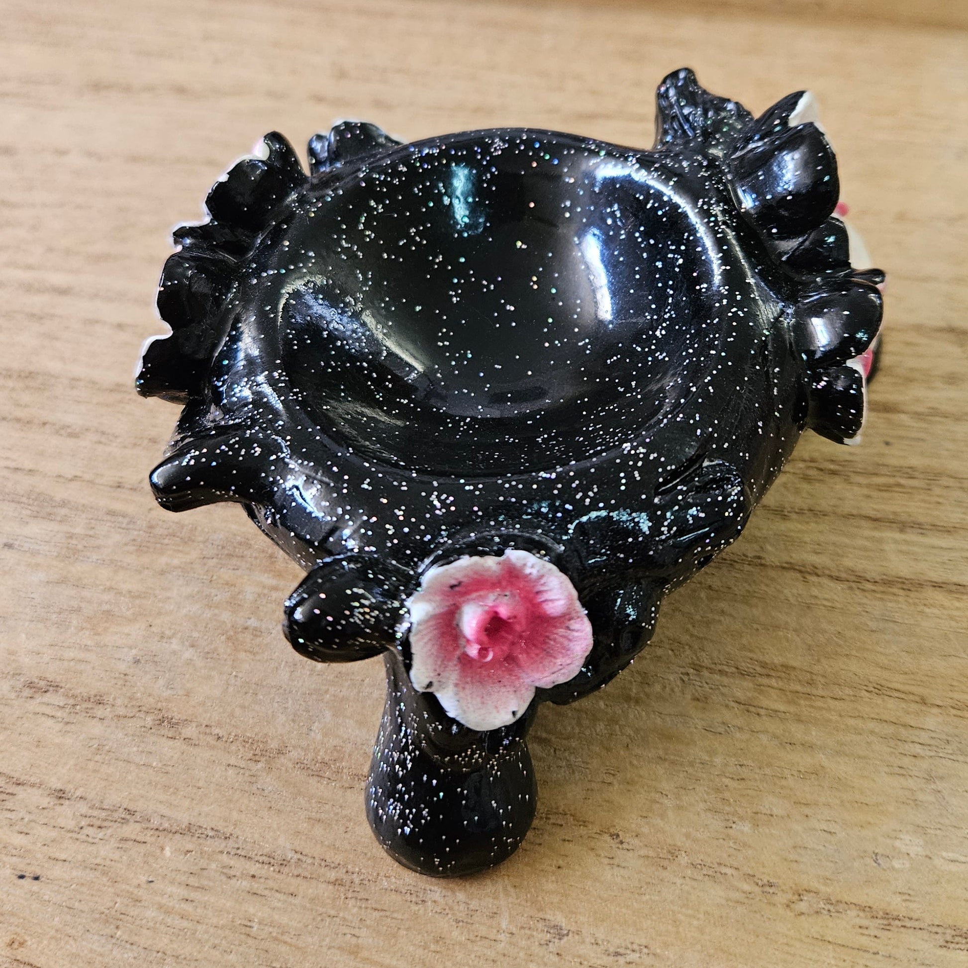 Our Black Holder with Pink Cherry Blossoms is the perfect addition to your desk or vanity. The cute cherry blossom sphere stand is adorned with holographic glitter, adding a touch of sparkle to your space. Add some fun into your organization and style with this unique and charming piece. Made with resin material & hand painted finishes this holder perfectly fits larger spheres and goes well with many colour schemes!