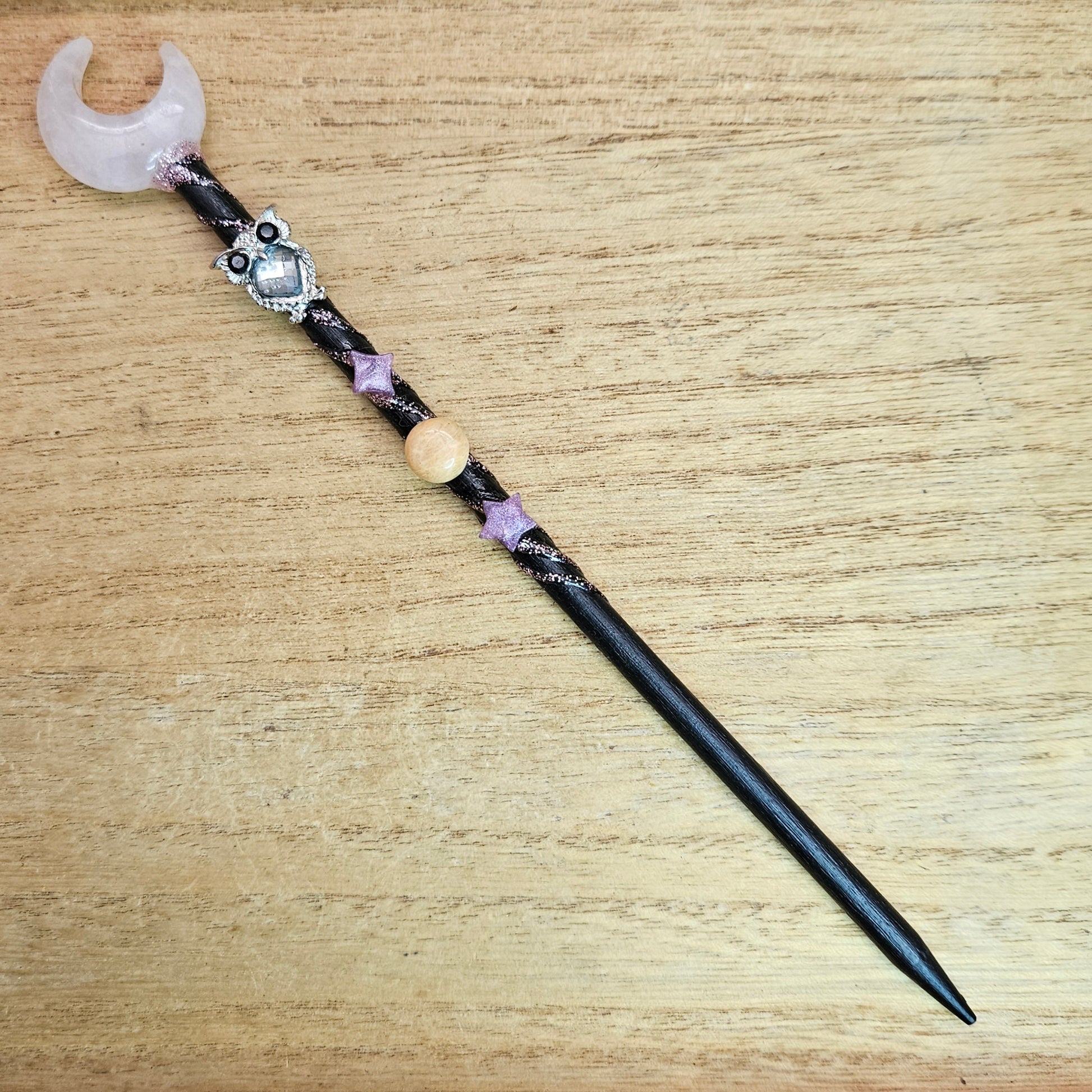 The Black Moon Owl Wand is sure to enchant any user with its handmade design. Adorned with a rose quartz moon, owl charm, pink stars, and a Peach Moonstone Button, this wand provides a touch of magic and elegance. Perfect for any witch or wizard seeking guidance and love.
