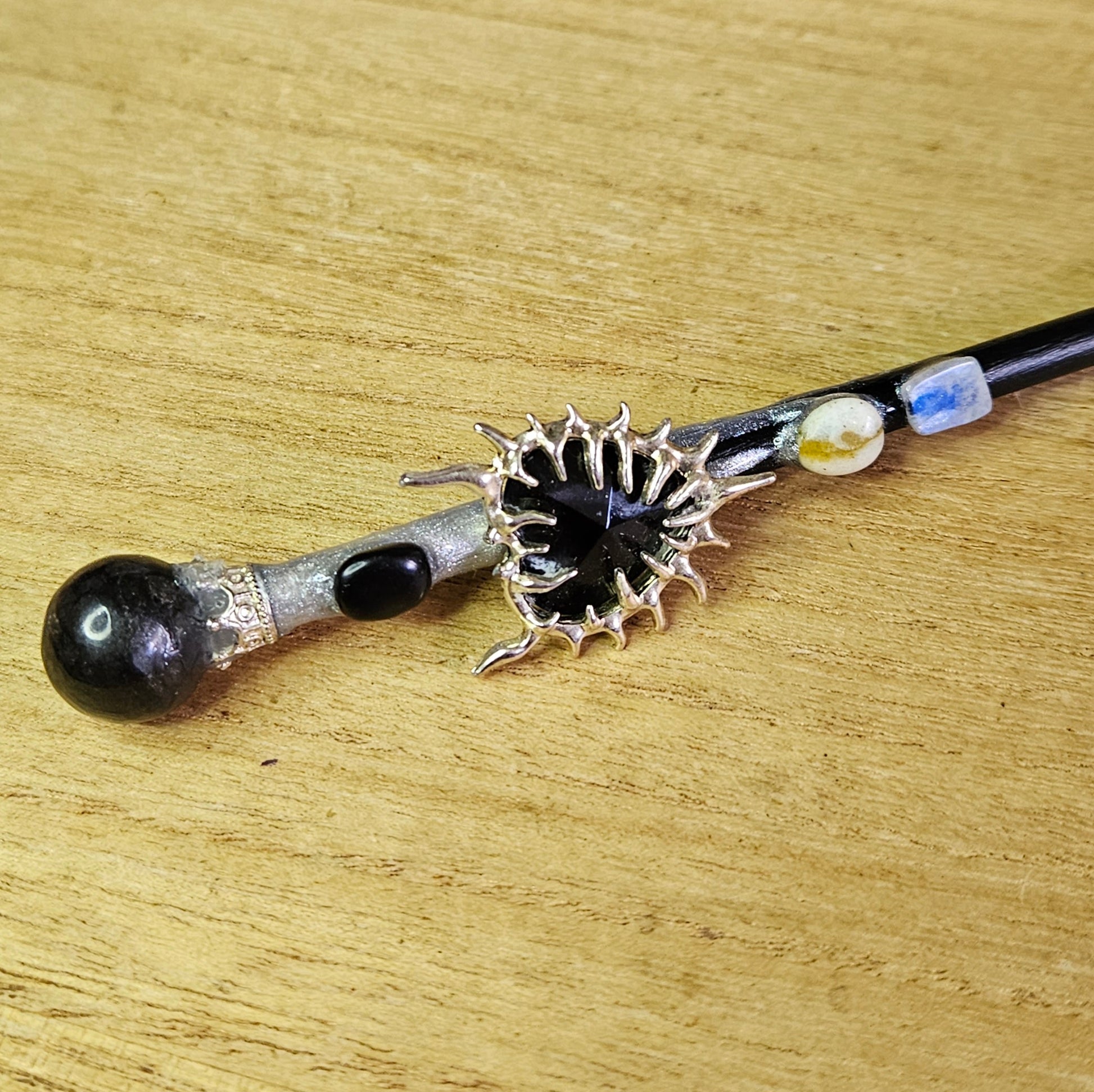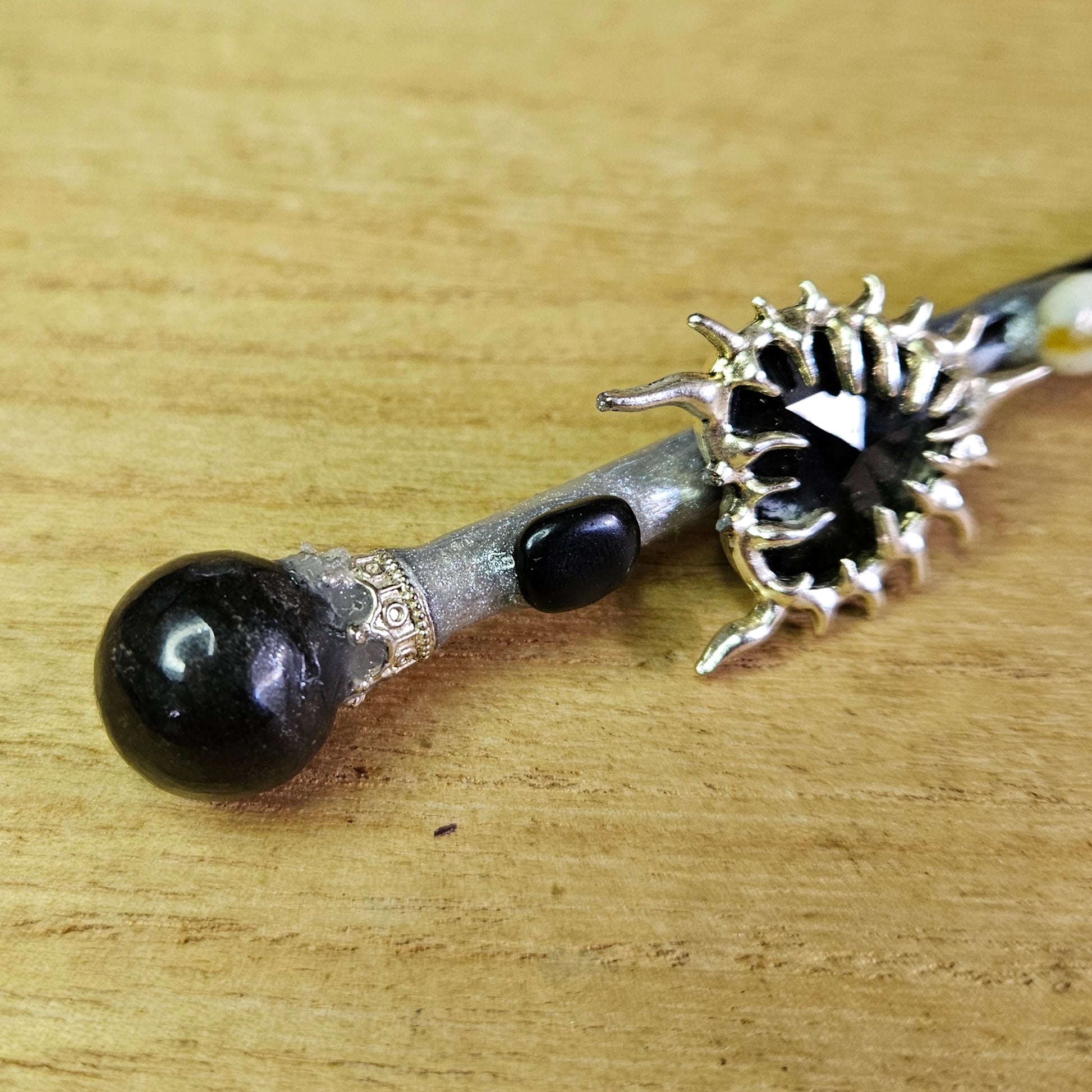 Discover the beauty and power of our Black Spiked Heart Wand. Expertly handcrafted with an obsidian sphere atop a silver crown, adorned with a striking silver and black heart charm. Decorated with hand selected moonstone, obsidian, and lemon jade chips and made with uv resin for long-lasting durability. This wand is perfect for those seeking a touch of magic in their lives & home decor.
