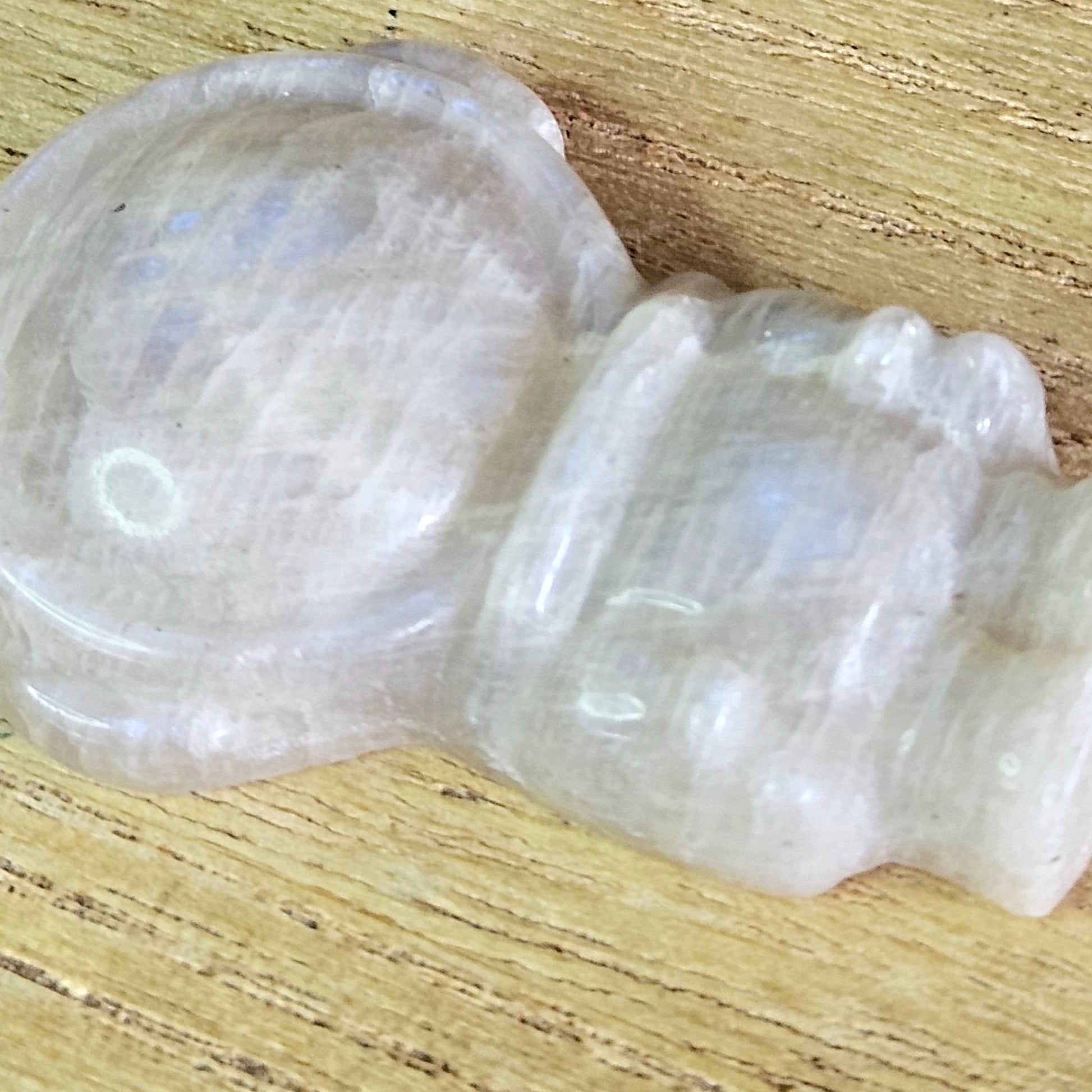 This Moonstone Astronaut is a charming 2D crystal carving, crafted from Blue moonstone. The cartoonish design adds a whimsical touch to this unique piece. Perfect for space enthusiasts or as a decorative collectible, this carving is a must-have for any crystal lover.