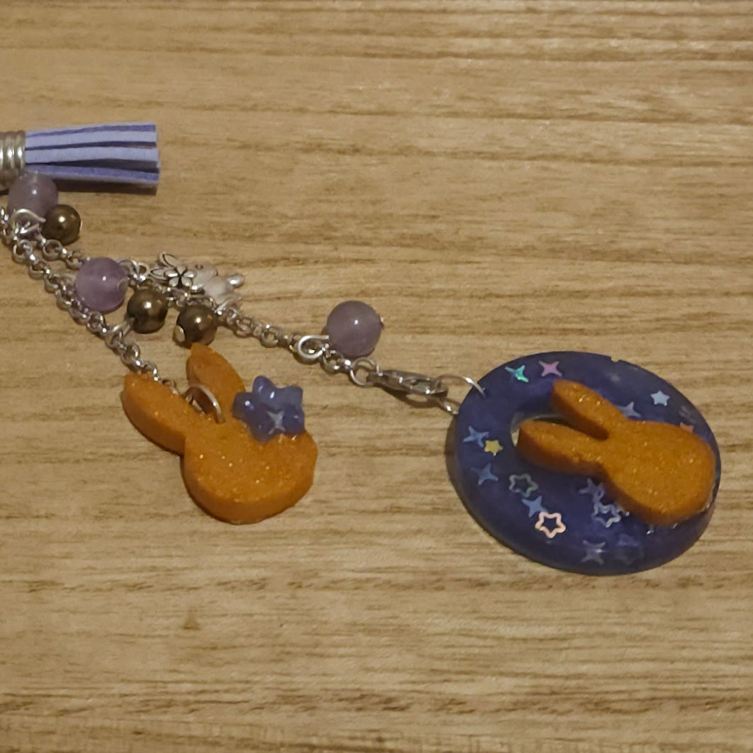 This adorable Boujee Bunny keychain features handcrafted resin bunny charms and beautiful pyrite and amethyst beads. Perfect for adding a touch of charm to your keys, purse, or bag. Show off your unique style with this one-of-a-kind, handmade accessory!