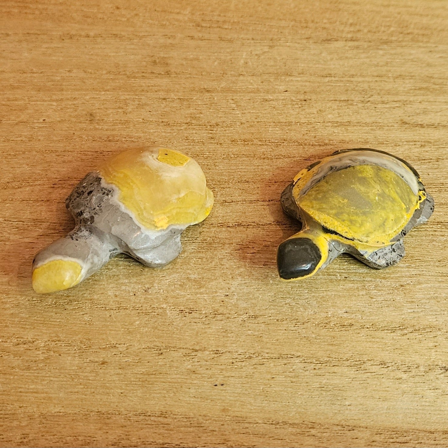 Experience the energy of the sea with our Bumblebee Jasper Turtle Carvings! Each handcrafted piece features the unique and vibrant combination of yellow, grey, and black colors found in bumblebee jasper. Add a touch of nature to your collection with one of these beautiful creations. Bumblebee Jasper is found exclusively near active volcanoes in West Java, Indonesia, primarily around Mount Papandayan and also noted near Mount Ciremai, where unique volcanic conditions create its distinctive black, yellow, and orange banded patterns from minerals like calcite, sulfur, and pyrite.