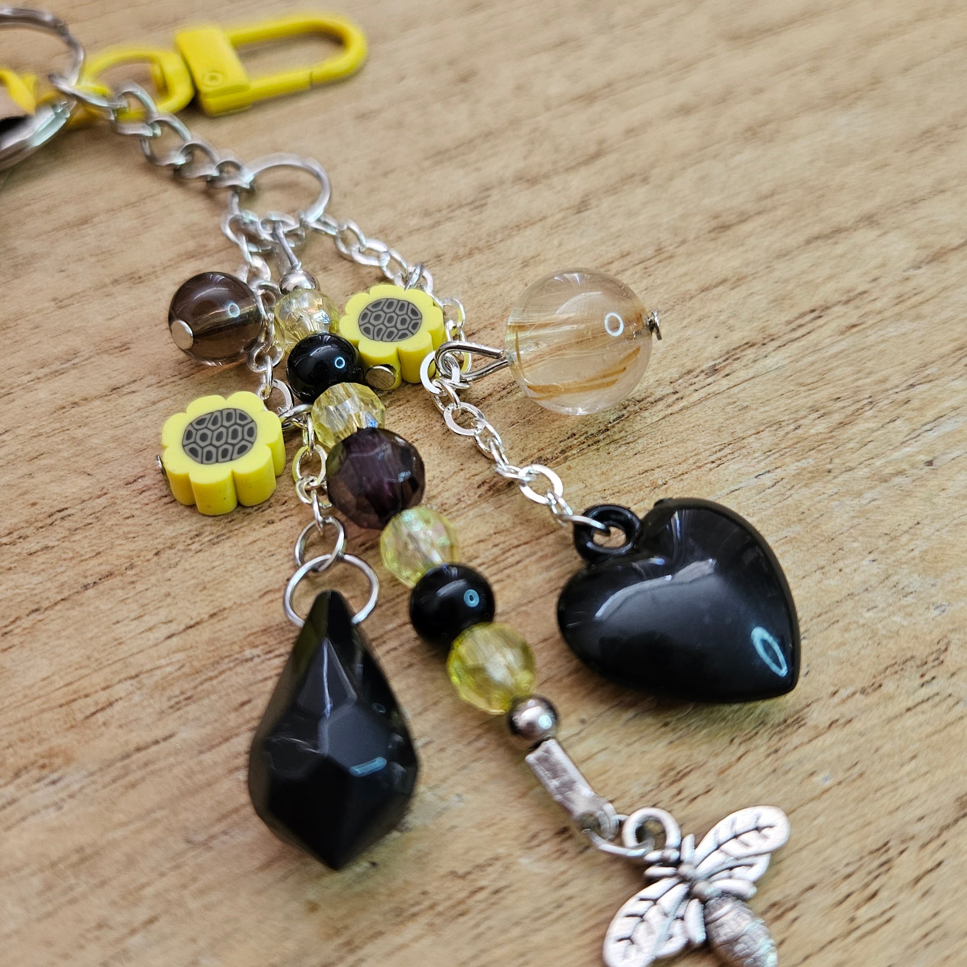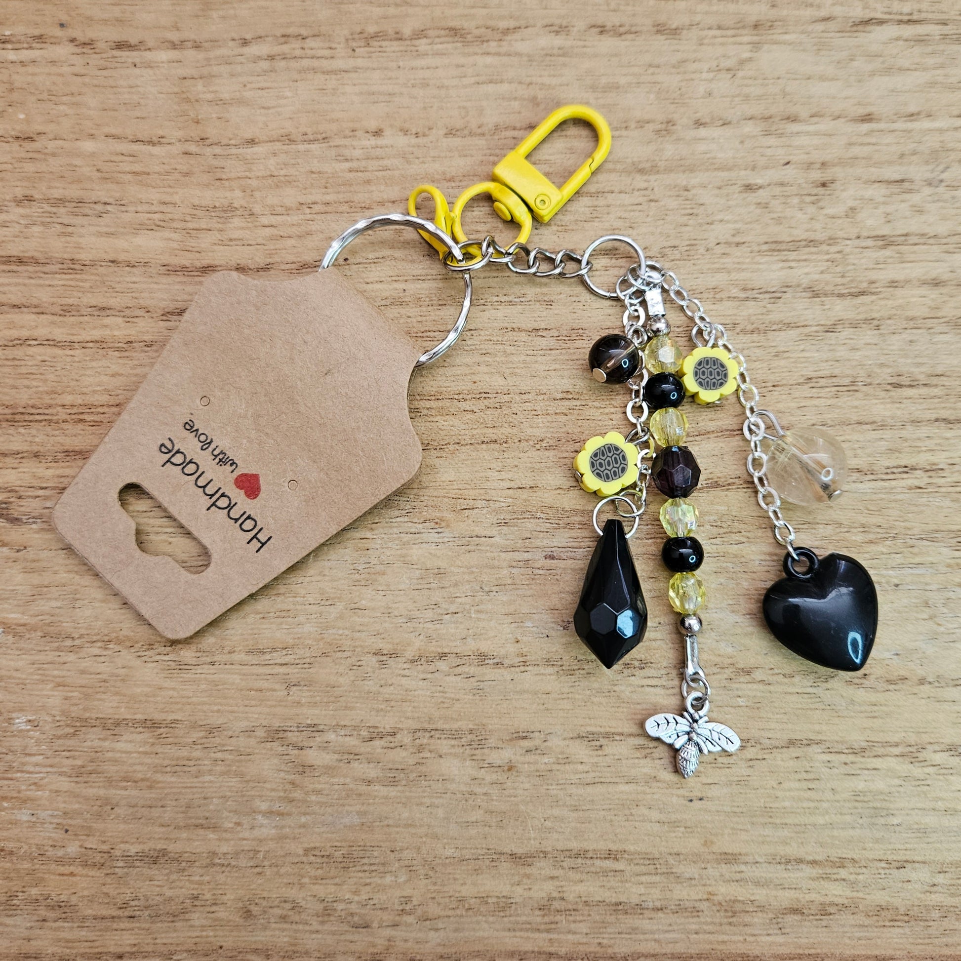 Our Bumblebee Keychain is the perfect accessory for any nature lover! Featuring charming bee and sunflower charms, along with a beautiful gold rutile bead and a black Heart this keychain is both stylish and functional. Bring a touch of nature wherever you go with our Bumblebee Keychain.