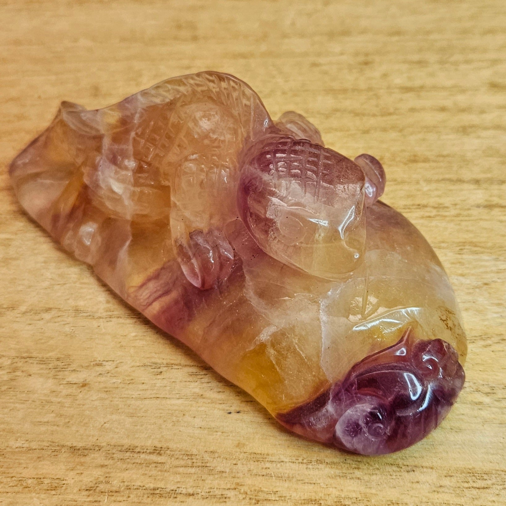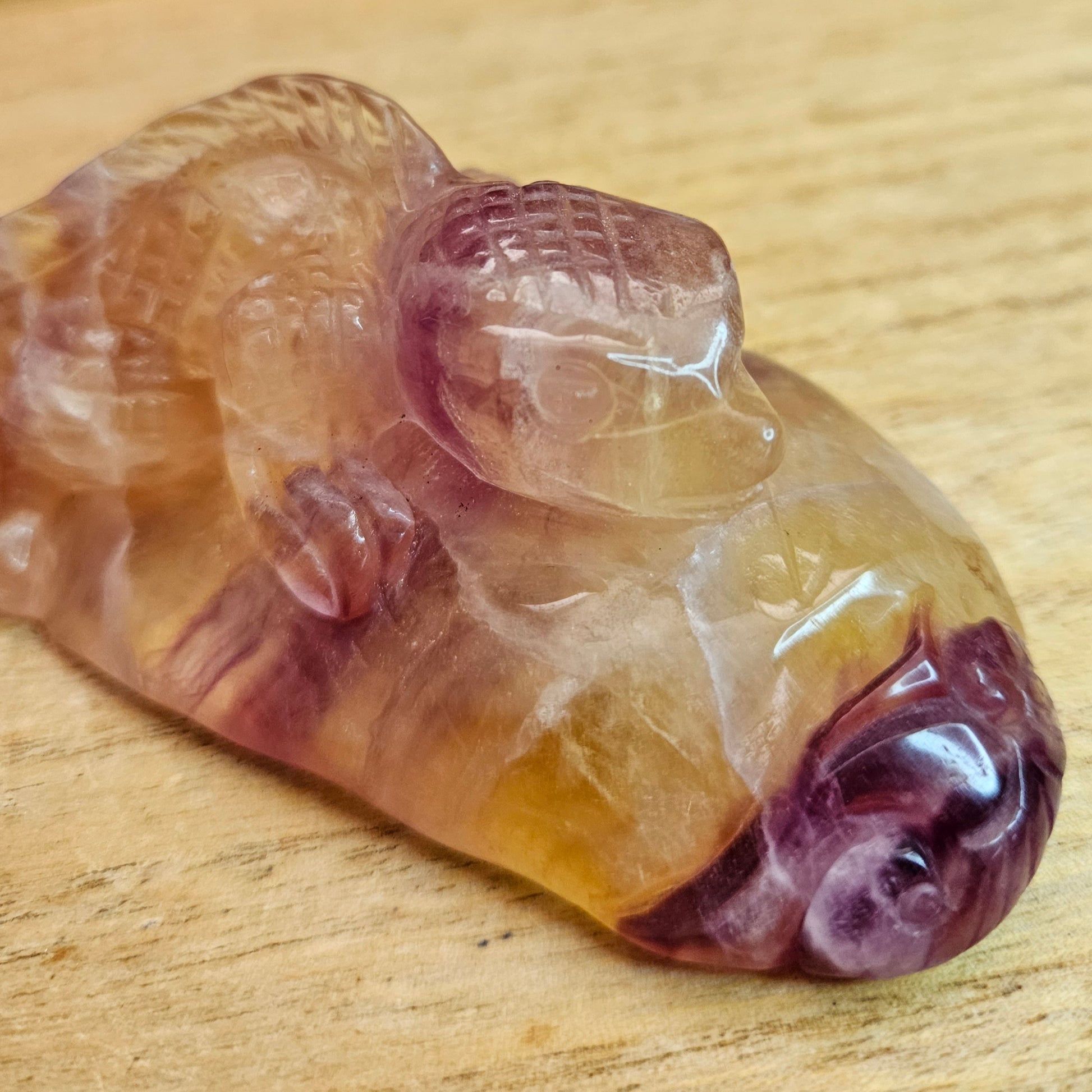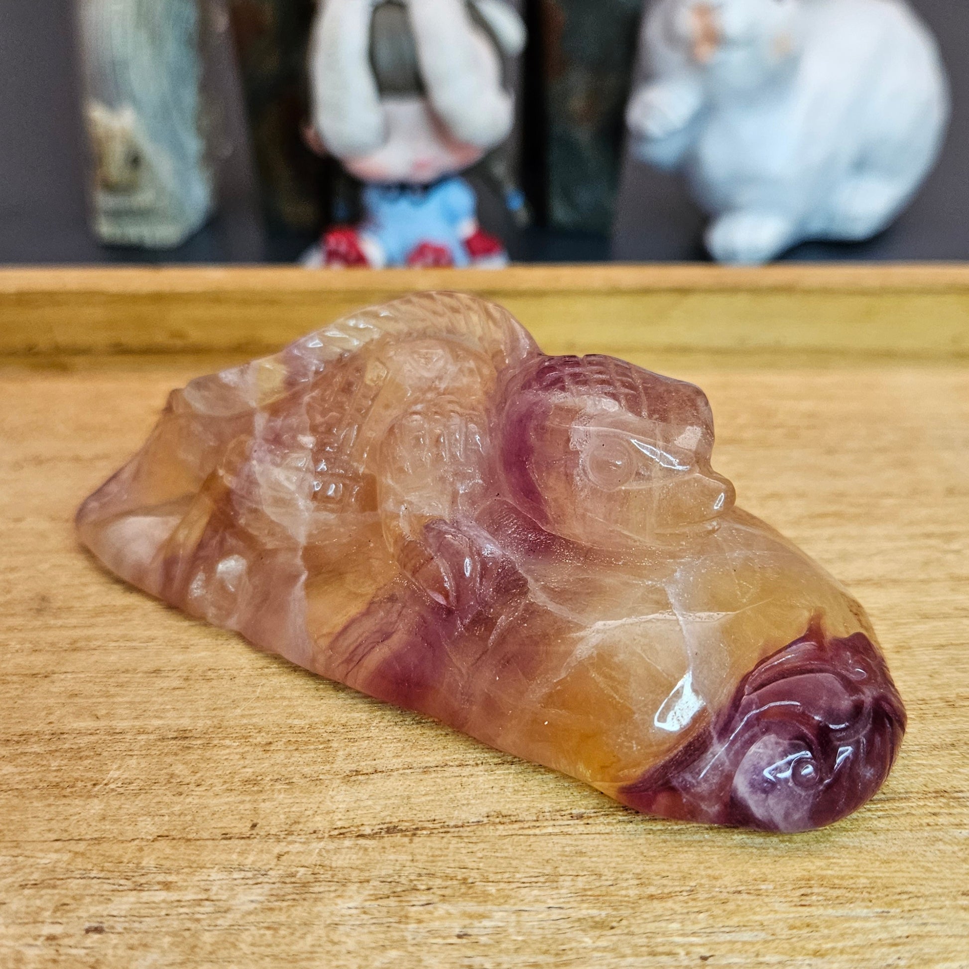 Add a touch of whimsy to your space with our Candy Fluorite Lizard Carving. This stunning piece features a hand-carved design in vibrant yellow and purple tones. The intricate details and floral base make it a unique and eye-catching addition to any collection.