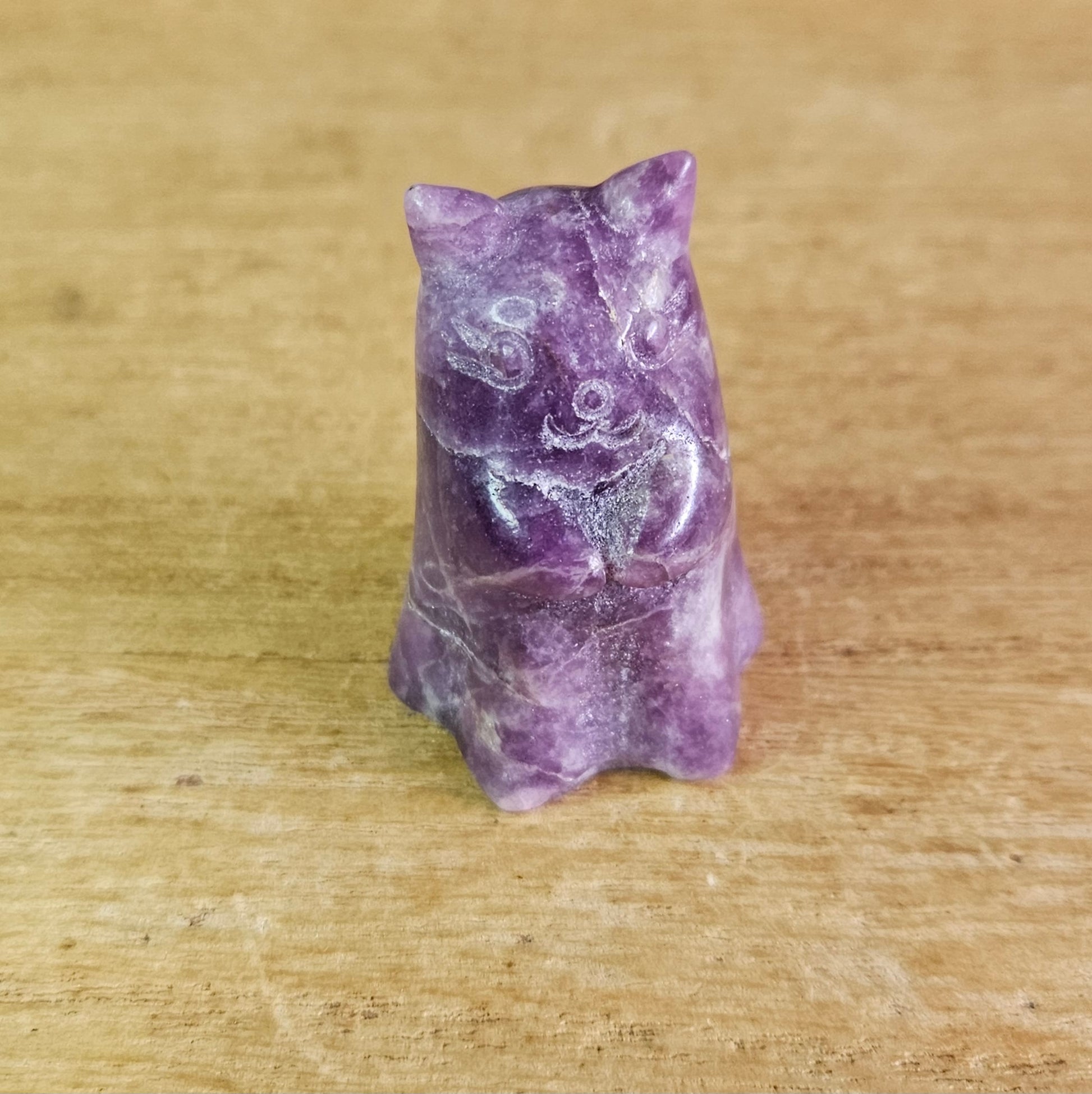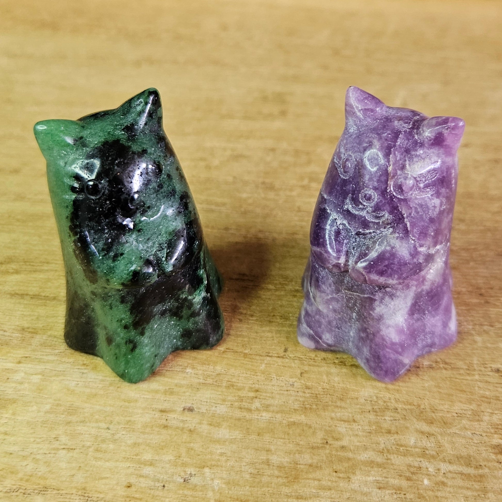 "Add a touch of whimsy to your home decor with our Cat Ghost Carving. Made of either Lepidolite or Ruby Zoizite, these adorable figurines will bring a playful spirit to any room. Choose between the two different materials to match your personal style.