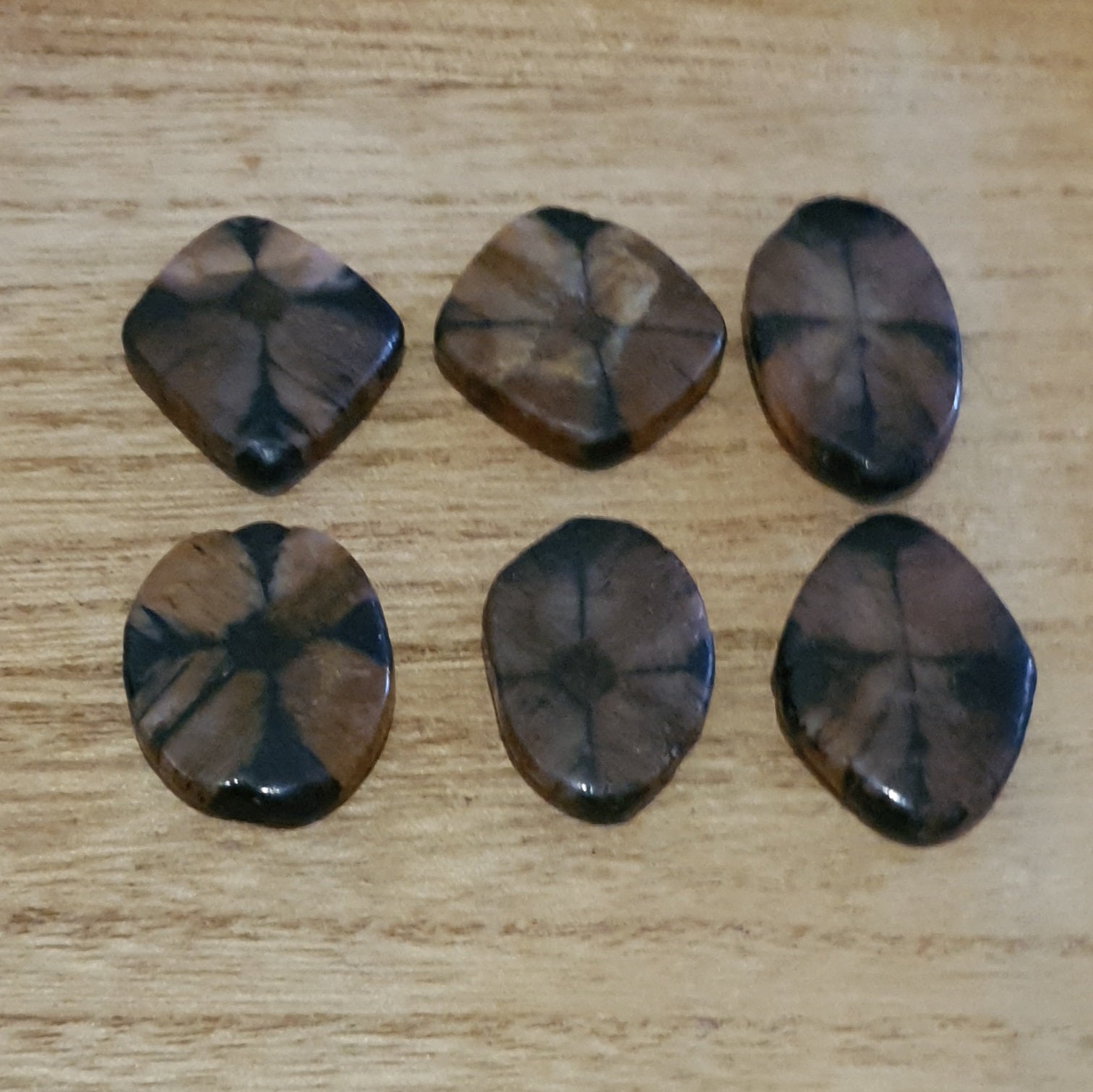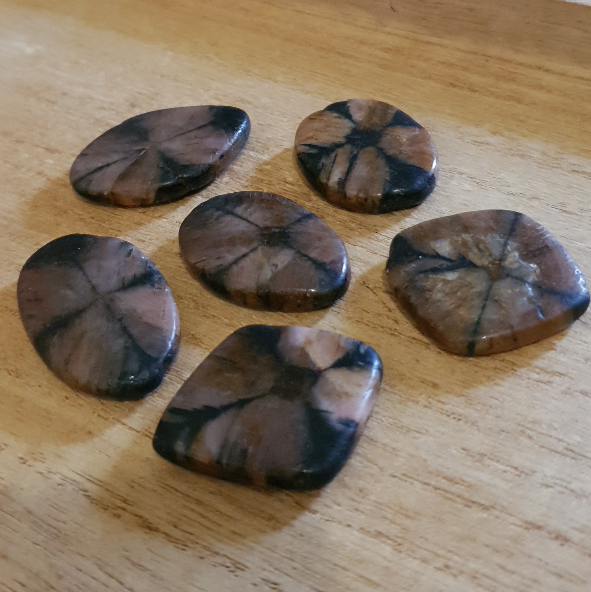 High quality Chiastolite Tumbled Stones, These Stones have earned themselves the trade name Cross Stones. A very rare variety of Andalusite, an aluminum nesosilicate mineral with crossed shaped inclusions of black Graphite and Carbon. The cross can only be seen when this mineral is sliced, though it does run throughout the entire stone. Chiastolite only has three active localities which include central Massachusetts in the United States, Asturias in Spain, and the Bimbowrie Conservation Park in Olary Province, South Australia.