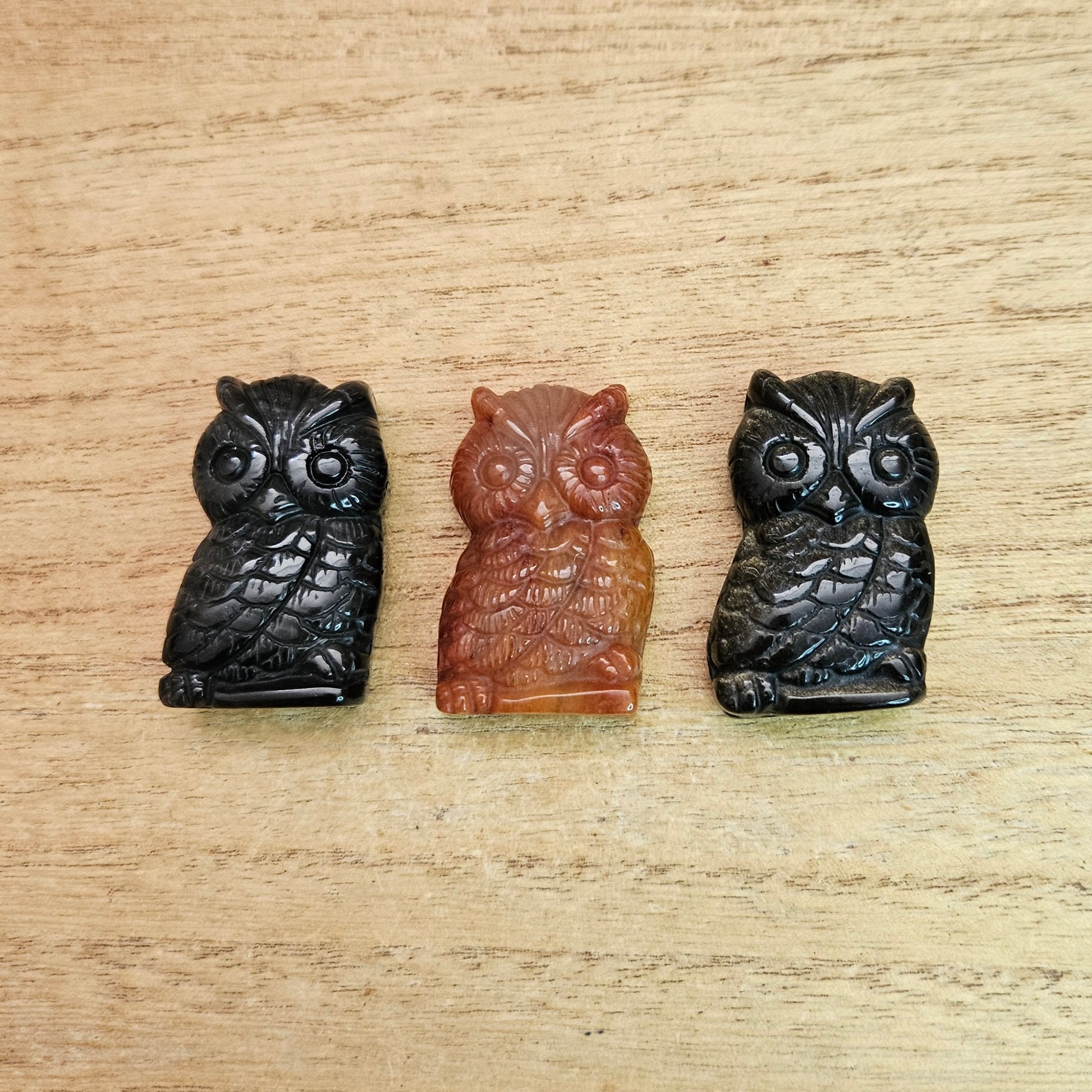 Add an adorable touch to your home decor with our cute owl flat carvings, available in various materials. Each carving is sold separately there is carnelian, silver sheen obsidian, and gold sheen obsidian to choose from. Express your unique style with these charming and versatile decorative pieces.