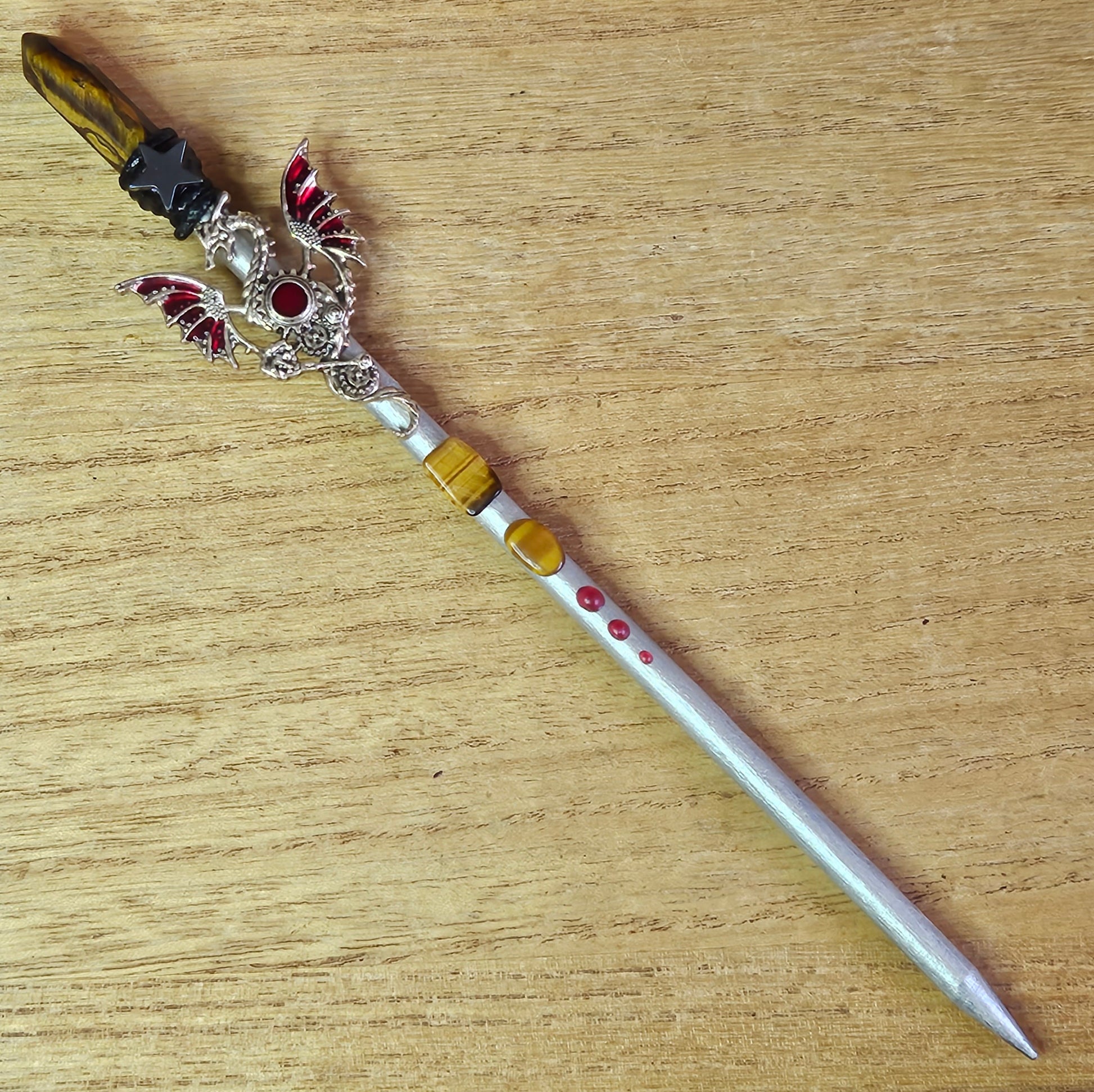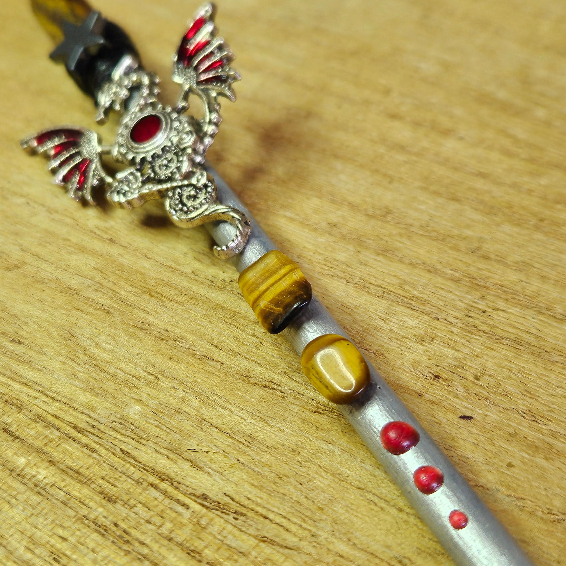 This Dragon Star Wand combines the mystifying properties of tiger's eye with the strength and protection of hematite. Handcrafted with a silver & red Enamel dragon charm, adorned withhand picked Tigers eye chips and made uv resin for long-lasting durability. Enhance your home decor with this one of a kind art piece.