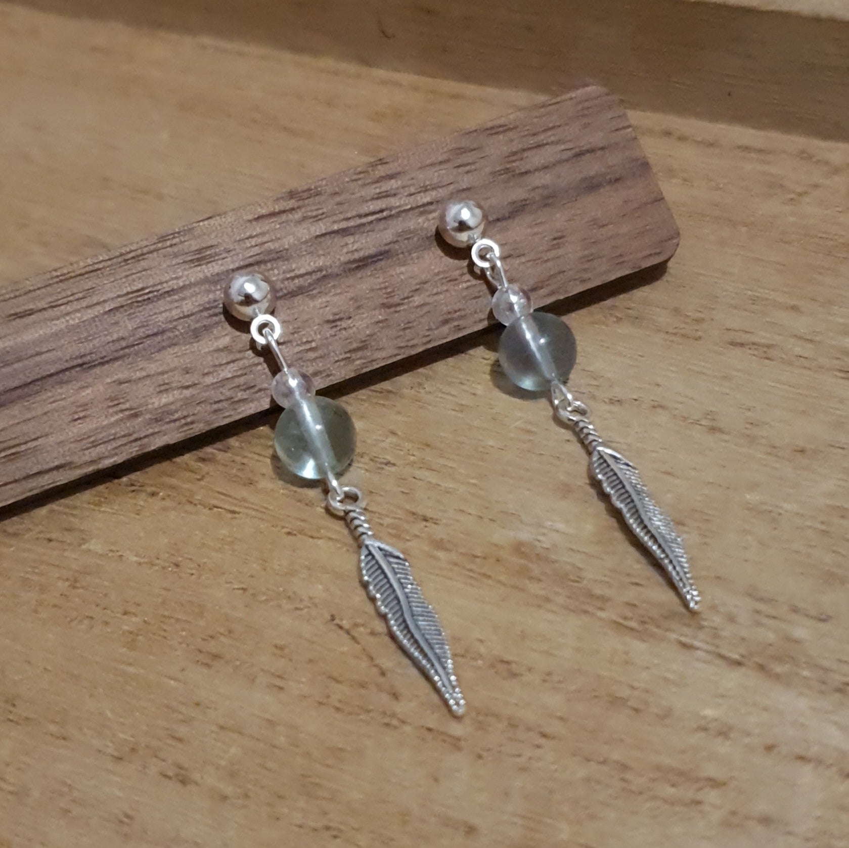 Feather Dangle Earrings. Green Fluorite and Feather Earrings.