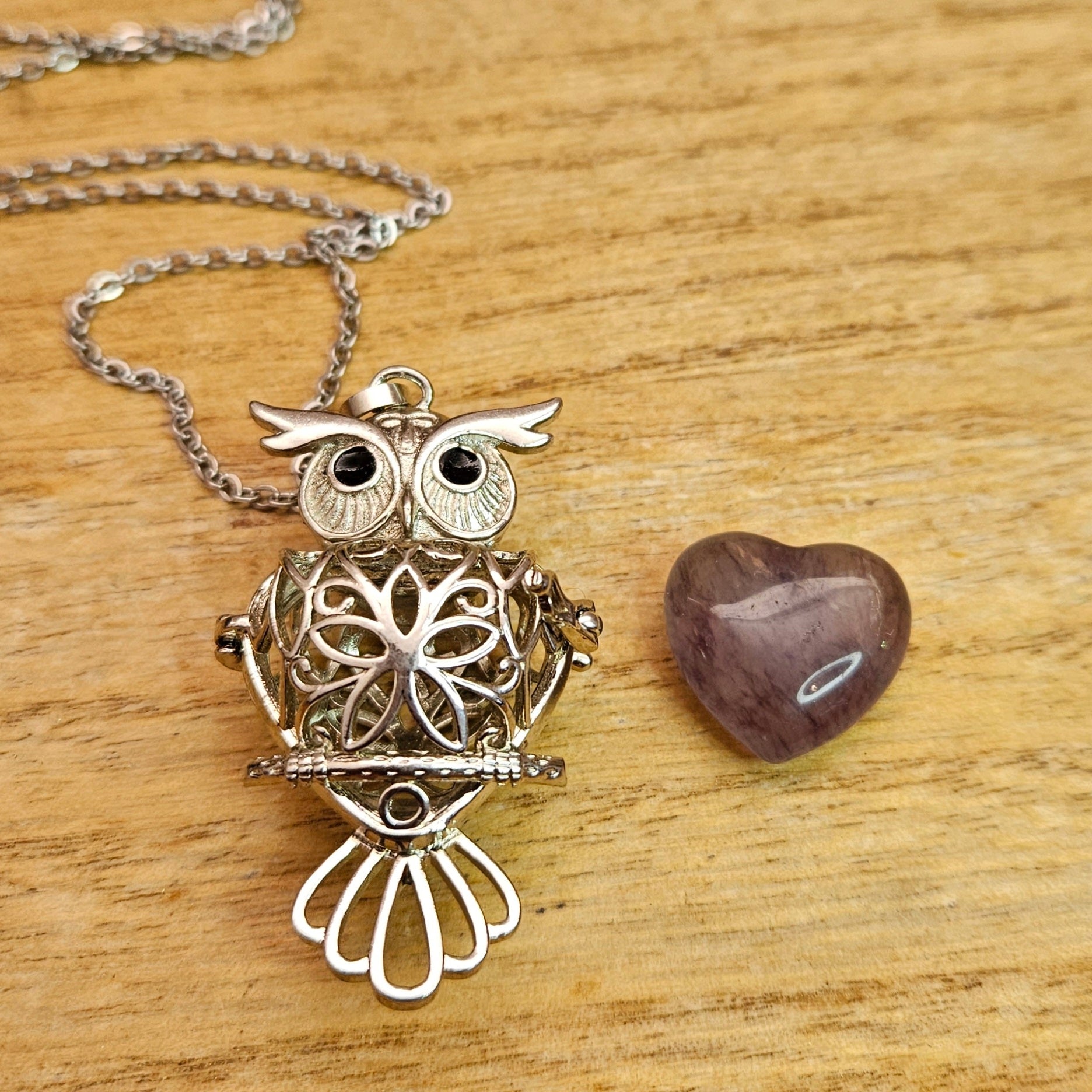 Add a unique touch to your style with our Fluorite Owl Cage Necklace. These adorable owl shaped pendants are designed to hold a small crystal Heart inside the chest. Containing a Fluorite heart this silver necklace is both stylish and meaningful. Perfect for animal lovers and crystal enthusiasts alike.