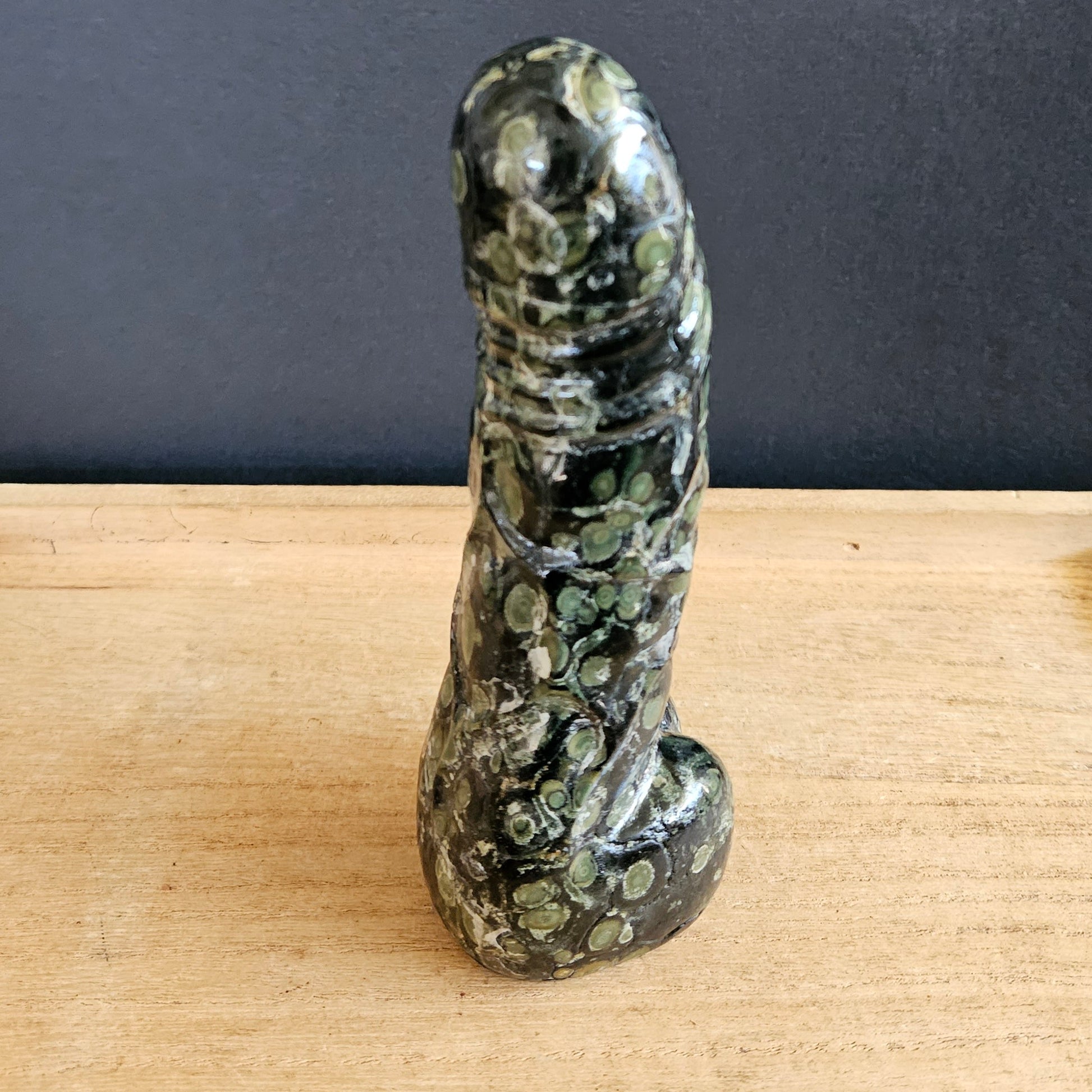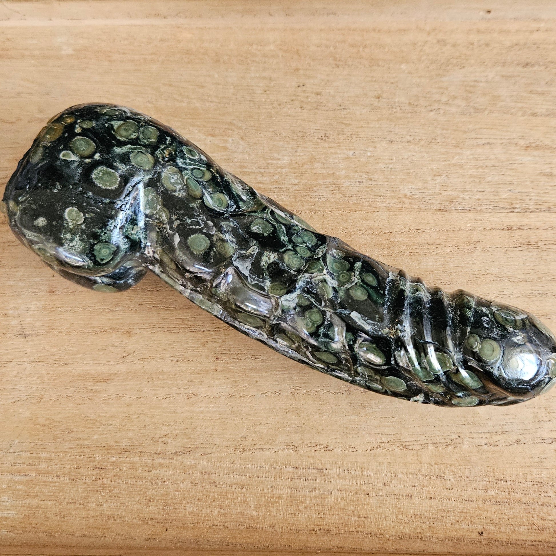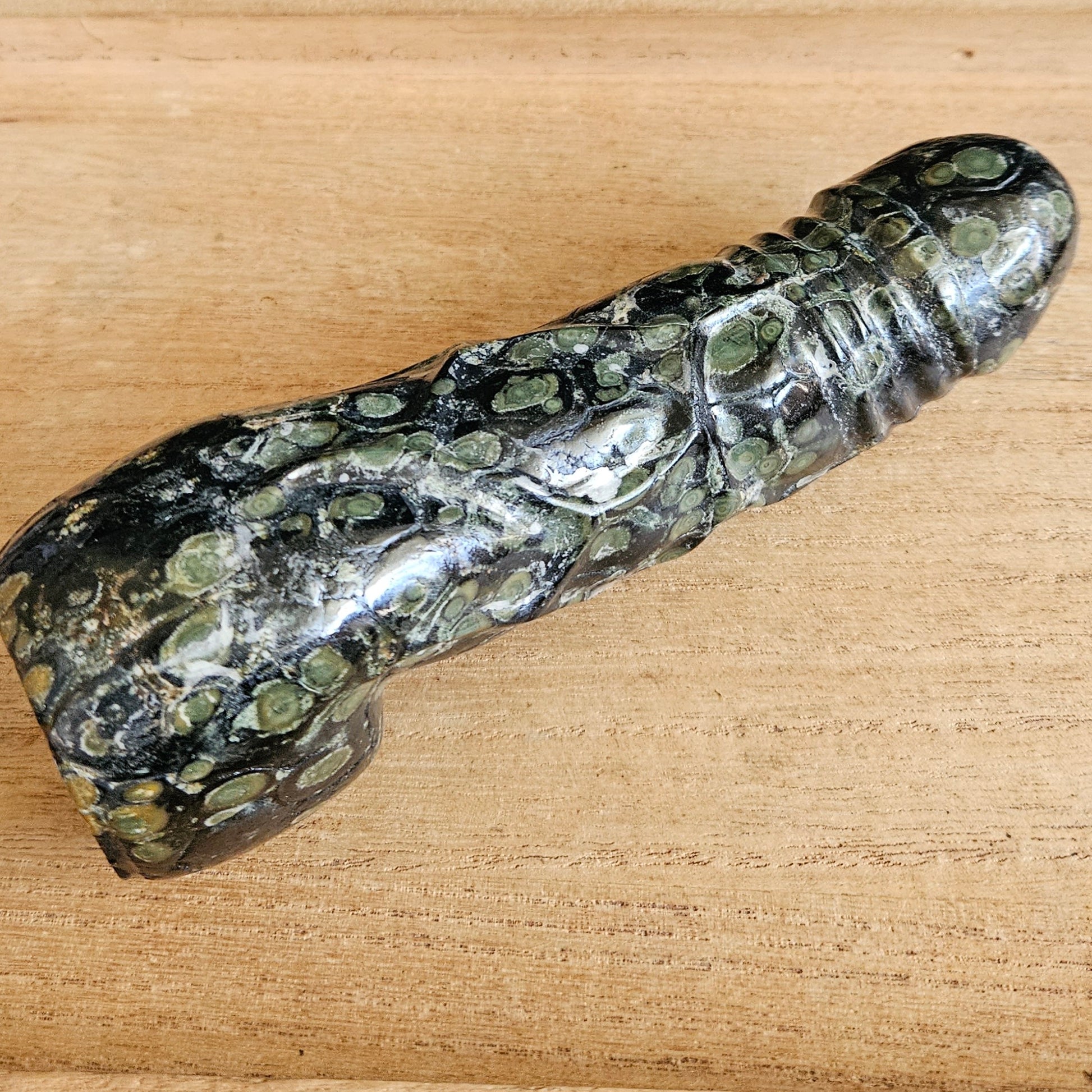Turn your decor into a conversation starter with our Kambaba Jasper Cock Carving. Carefully crafted from kambaba jasper, this large, penis-shaped decoration is perfect for adding a touch of quirk and humor to any room. Perfectly hilarious for the easy going crystal collector. Kambaba Jasper, despite its name, isn't a true jasper but a fine-grained volcanic rock called rhyolite. It's known for its distinctive green and black swirling patterns, which are caused by various minerals like chlorite and hornblende for the green, and pyroxene or magnetite for the black orbicules, These patterns are formed through mineralization processes involving hydrothermal fluids within the rhyolite.