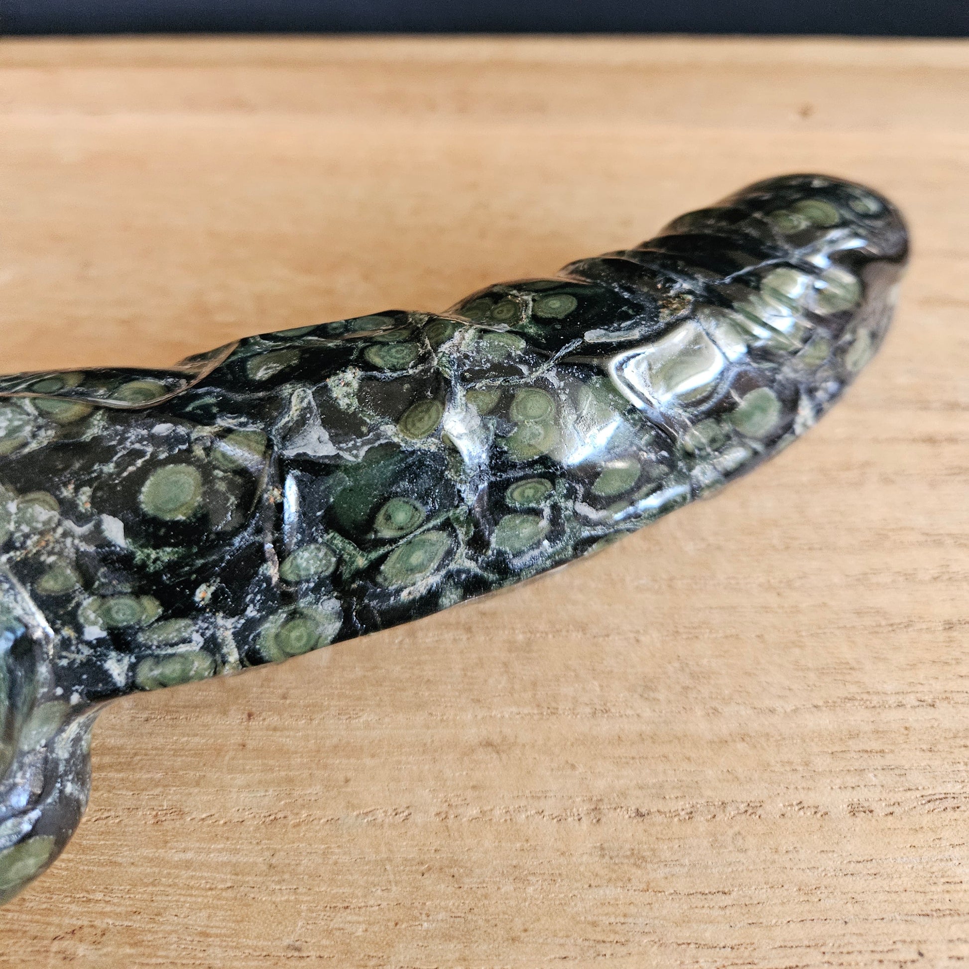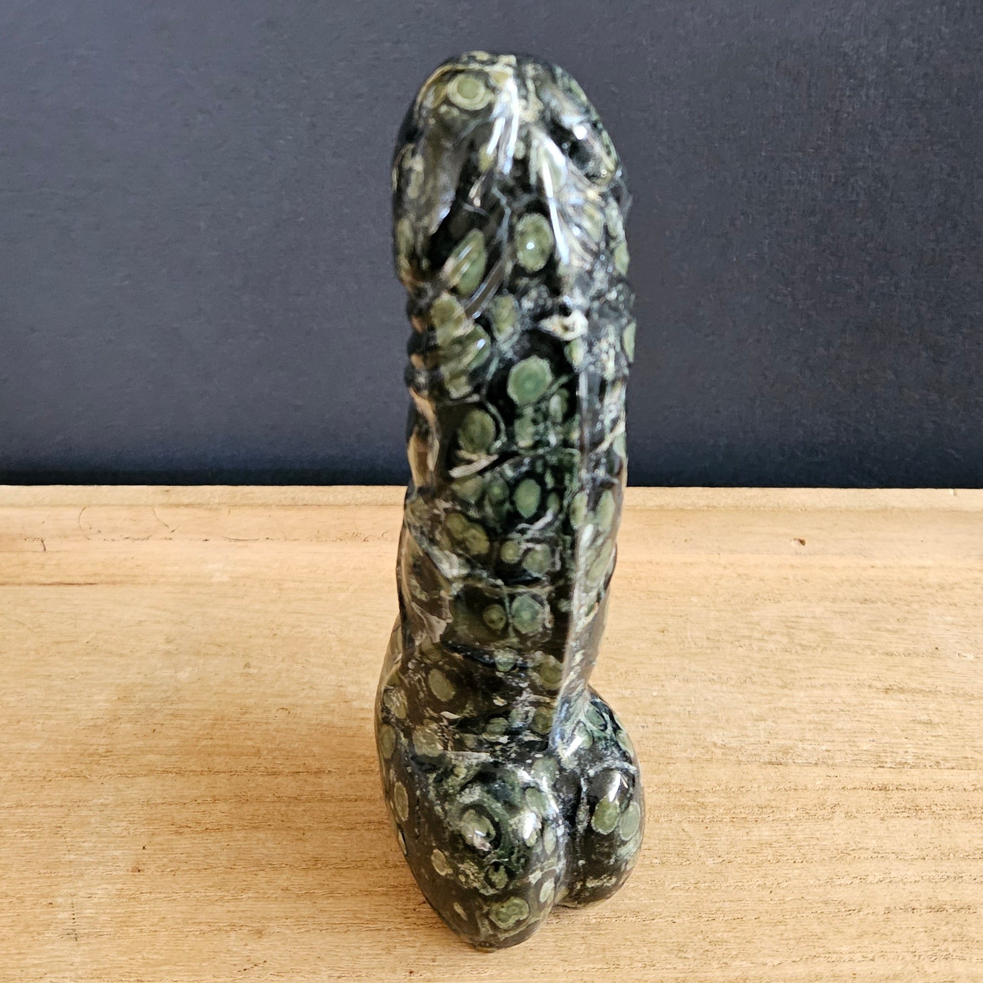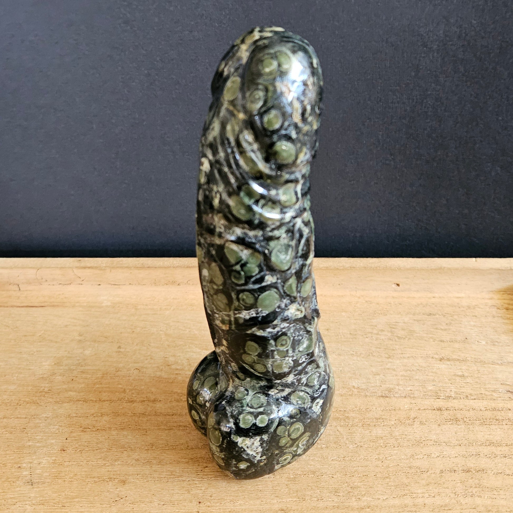 Turn your decor into a conversation starter with our Kambaba Jasper Cock Carving. Carefully crafted from kambaba jasper, this large, penis-shaped decoration is perfect for adding a touch of quirk and humor to any room. Perfectly hilarious for the easy going crystal collector. Kambaba Jasper, despite its name, isn't a true jasper but a fine-grained volcanic rock called rhyolite. It's known for its distinctive green and black swirling patterns, which are caused by various minerals like chlorite and hornblende for the green, and pyroxene or magnetite for the black orbicules, These patterns are formed through mineralization processes involving hydrothermal fluids within the rhyolite.