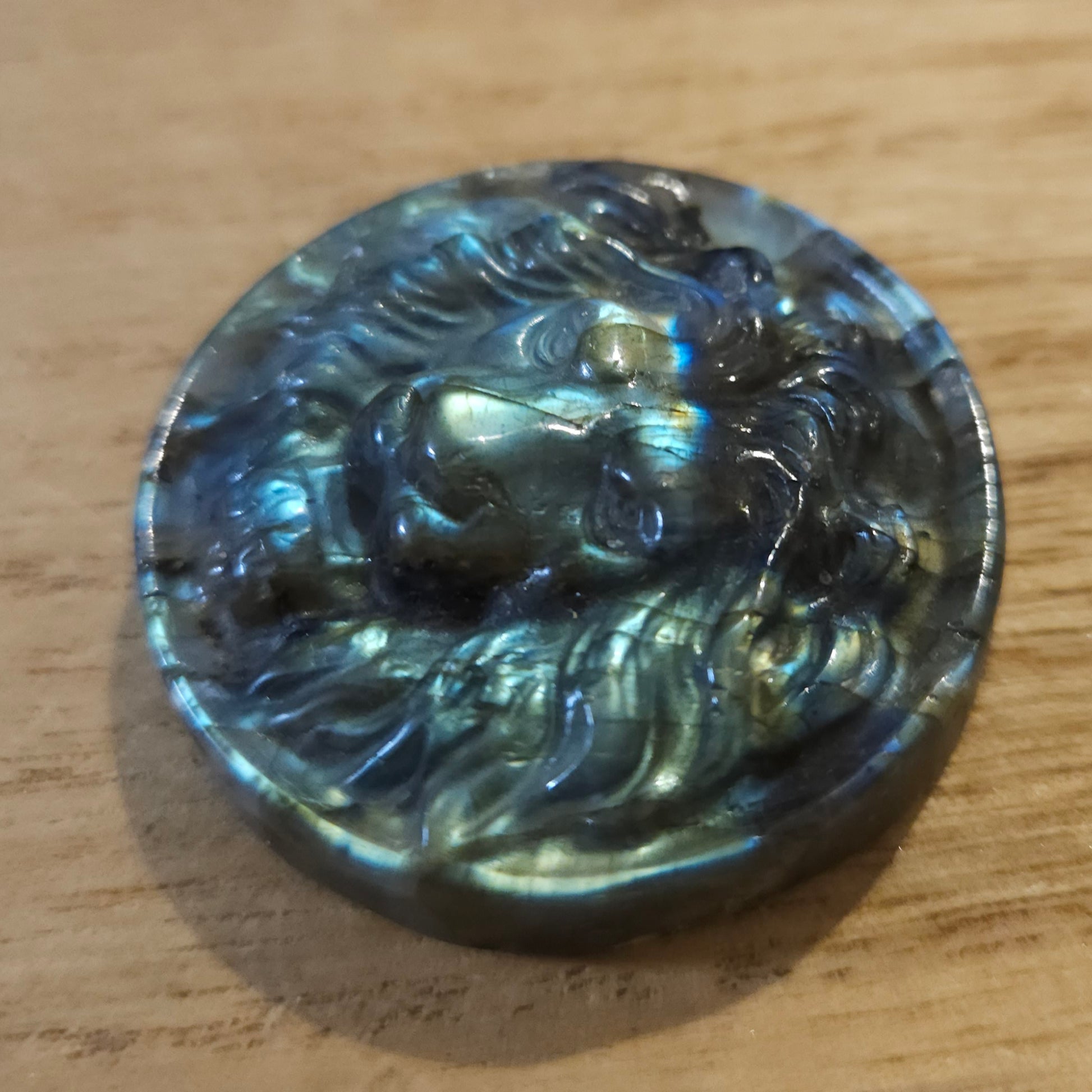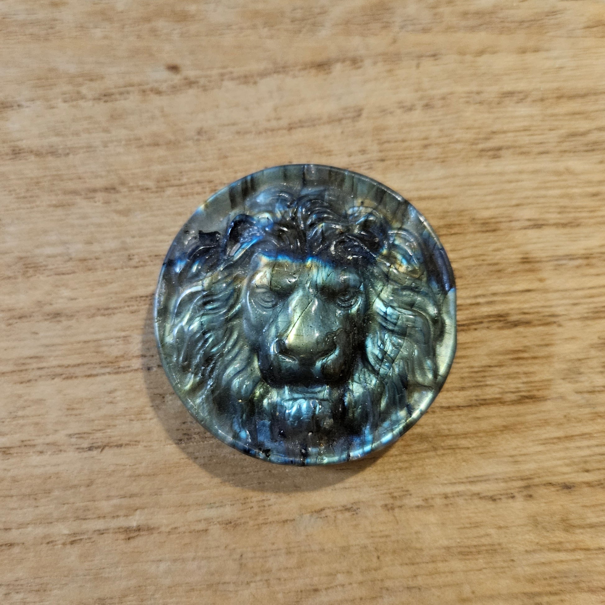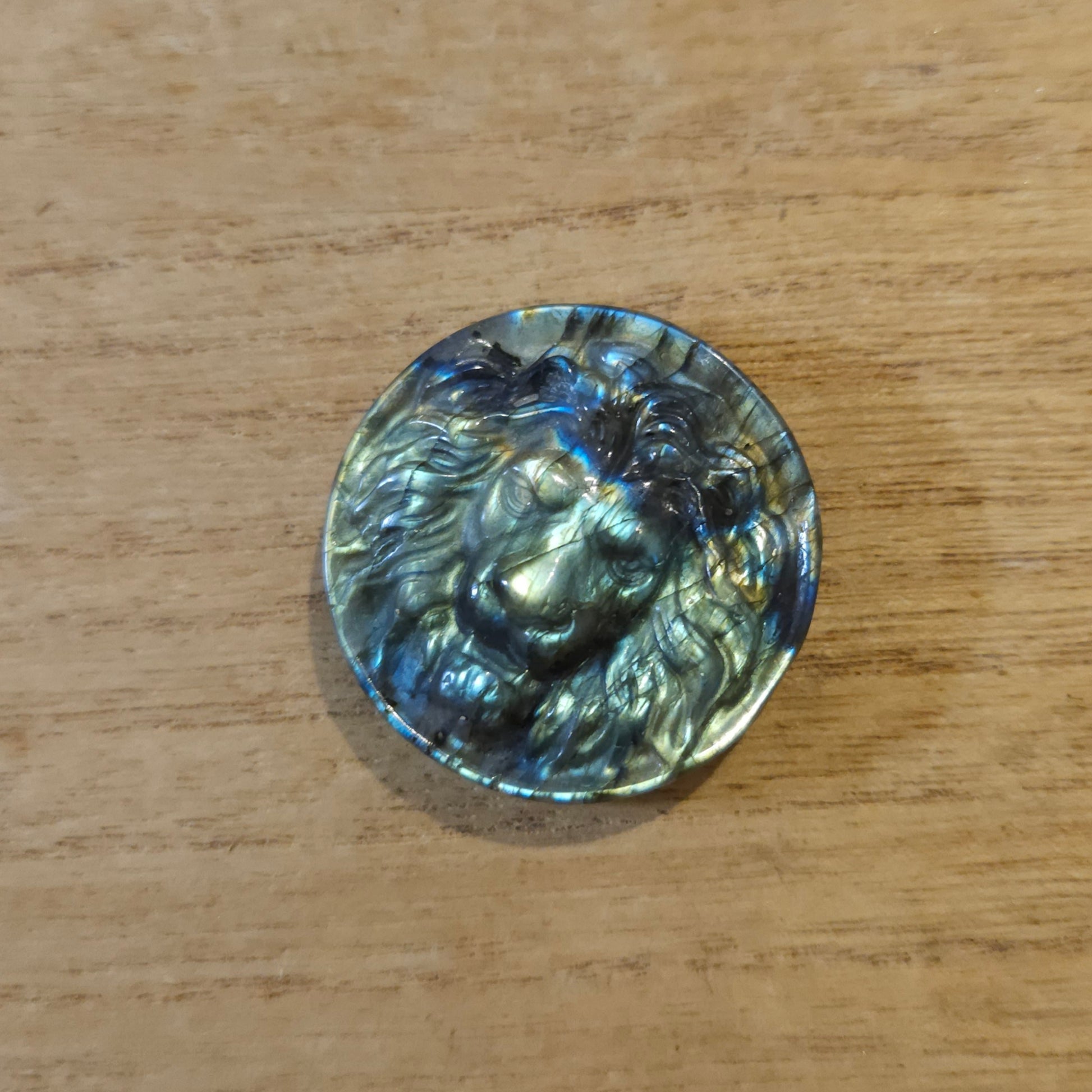 Experience the powerful energy of this Labradorite lion face carving! Skillfully crafted onto a flat Cabacon shape, this unique piece boasts intricate details and breathtaking blue flashes. Let the mesmerizing beauty of this piece inspire and energize you. Labradorite is a feldspar mineral known for its iridescent flashes of color, a phenomenon called labradorescence. It's a member of the plagioclase group and can be found in various shades of grey, white, and brown, often with displays of blue, green, and other colors.