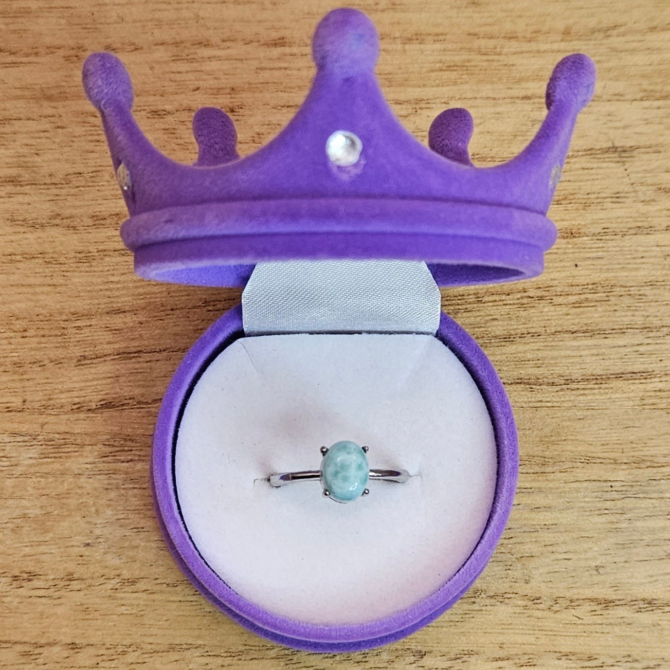 This Larimar Oval Adjustable Ring features a stunning blue oval gem that is not only beautiful, but also promotes tranquility and calmness. The simple silver band adds a touch of elegance, while the adjustable feature ensures a perfect fit. With its unique and intricate patterns, this ring is a must have for any costume jewelry collection.