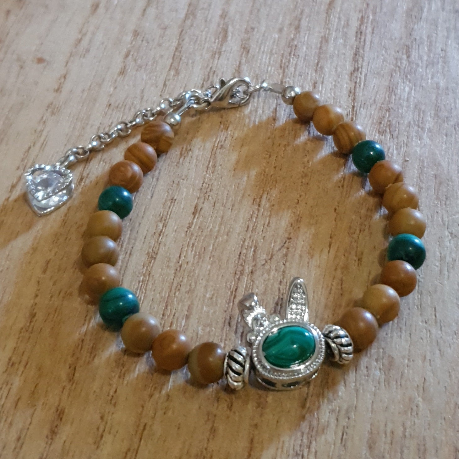 Here at Happy Crystal Geeks we love bunnys and what better way to display your support of our small business by wearing this gorgeous malachite and Petrified Wood Handmade Adjustable Bracelet with a gorgeous malachite bunny charm!