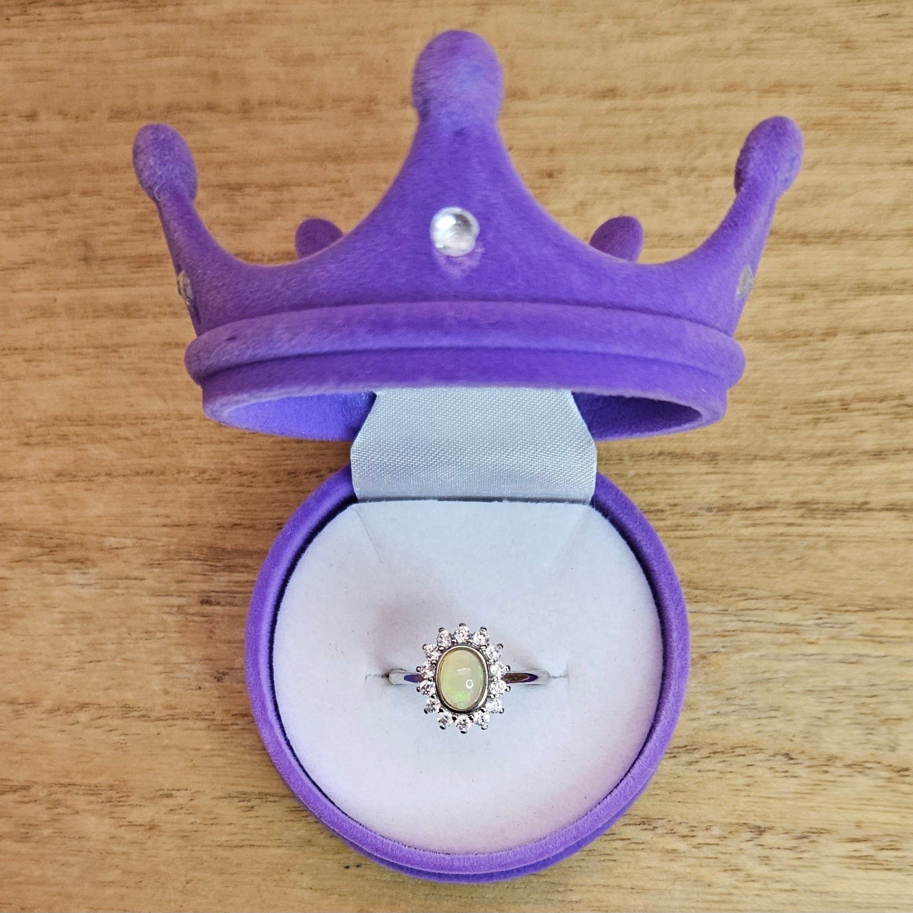 This Opal Oval Adjustable Ring features a stunning oval opal with flashes of green and red. The silver coloured band adds a touch of elegance while the surrounding cubic zirconias add a touch of sparkle. With its adjustable fit, this ring is the perfect addition to any jewelry collection.