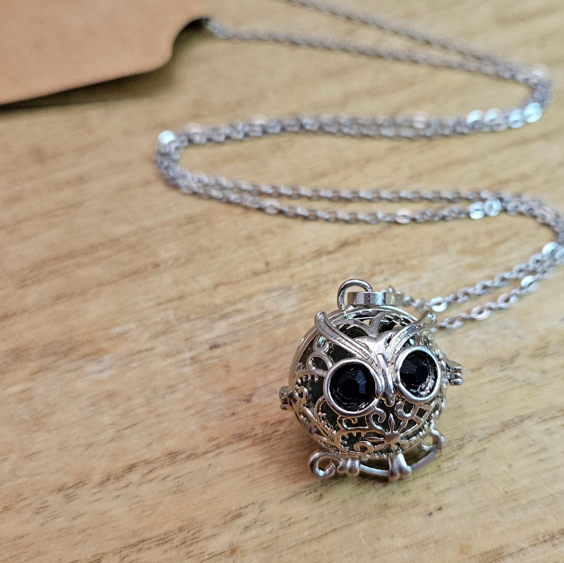 This owl cage necklace is the perfect accessory for owl lovers and crystal enthusiasts. The round pendant is designed to hold a small sphere, this particular necklace comes with a green Fluorite Sphere allowing you to carry positive energy and good vibes with you wherever you go. It's a unique and stylish piece that truly stands out.