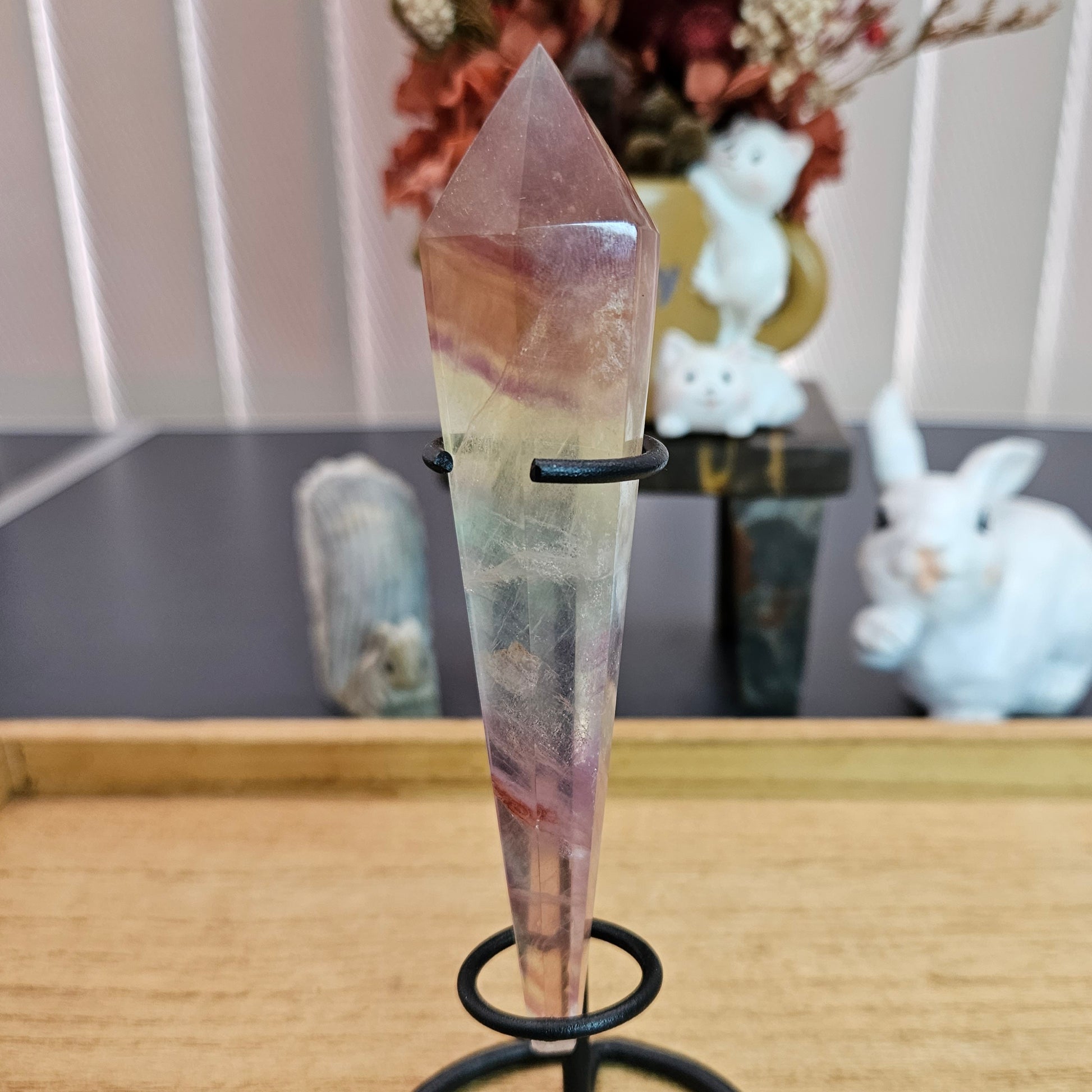 This Rainbow Fluorite Wand & Stand is perfect for displaying and using in crystal healing. Rainbow Fluorite is known for its ability to cleanse and stabilize the aura, promoting focus and clarity. The black display stand adds a touch of elegance to this beautiful wand. Wands are used in meditation, spellwork, and energy healing to direct or clear energetic blockages, with healing energy believed to emanate from the points.