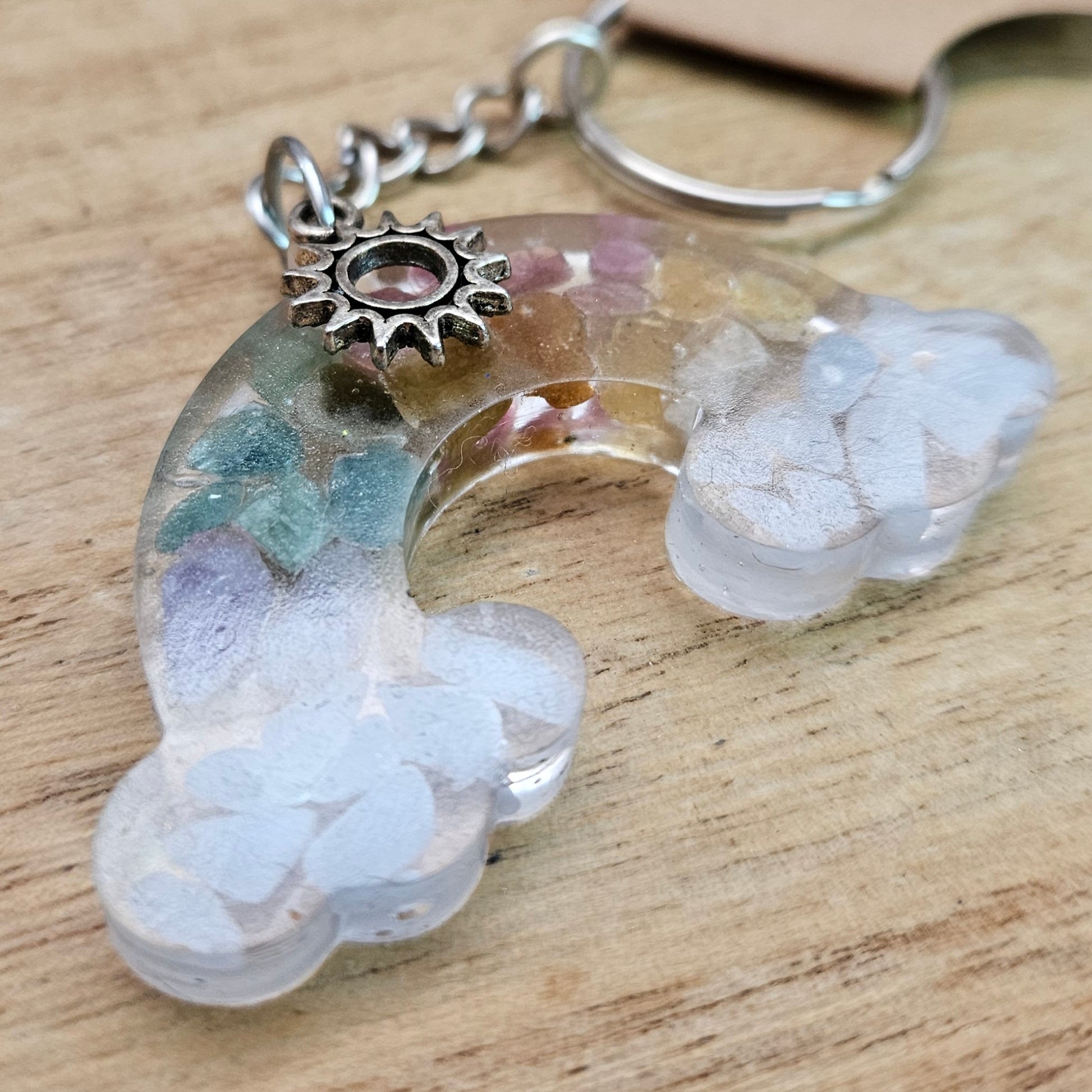 Celebrate diversity with our Rainbow Keychain, handcrafted with colorful resin and genuine rainbow Tourmaline and angelite chips. A small silver sun charm adds a touch of elegance to this unique accessory. Perfect for adding a pop of color to your keys or bag, and a reminder to embrace all the colors of the rainbow.