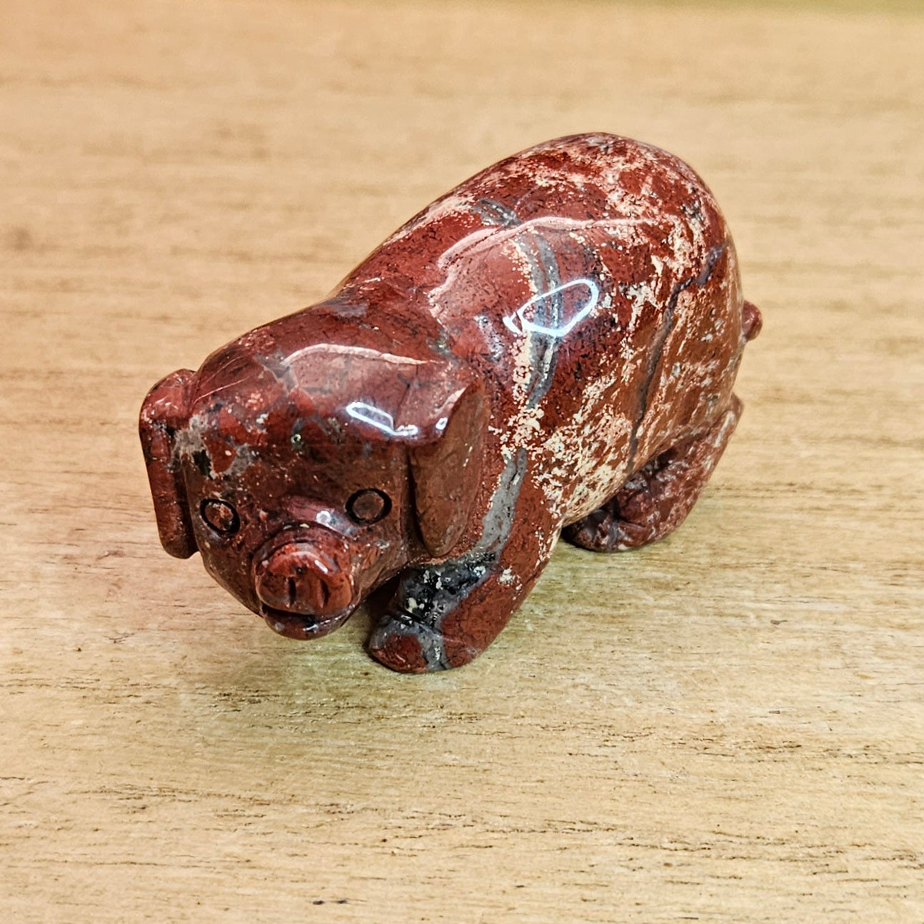 This adorable Red Jasper Pig Carving will be a charming addition to your collection. Hand-carved from a beautiful red jasper, its vibrant color and playful design is sure to bring joy and positive energy to your space. Perfect for pig lovers or anyone looking to add a touch of whimsy to their decor.
