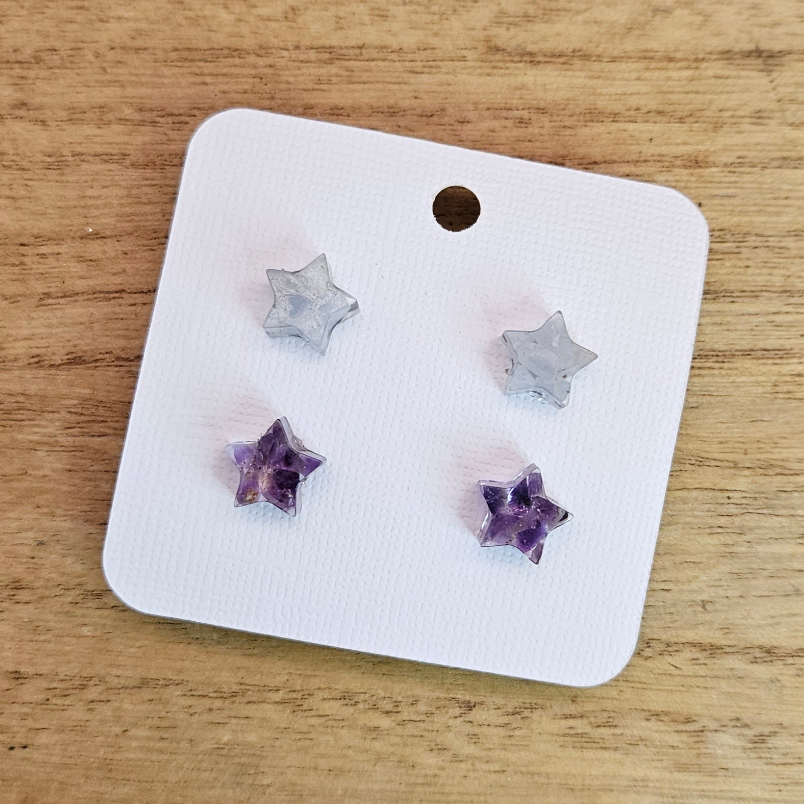 This Resin Star Stud Set includes two pairs of earrings, each featuring a unique combination of resin and semi-precious chips. The Angelite and Amethyst chips are arranged in the shape of 5 point star, adding a touch of elegance to any outfit. Handcrafted with care and expertise, these earrings are versatile and stylish.
