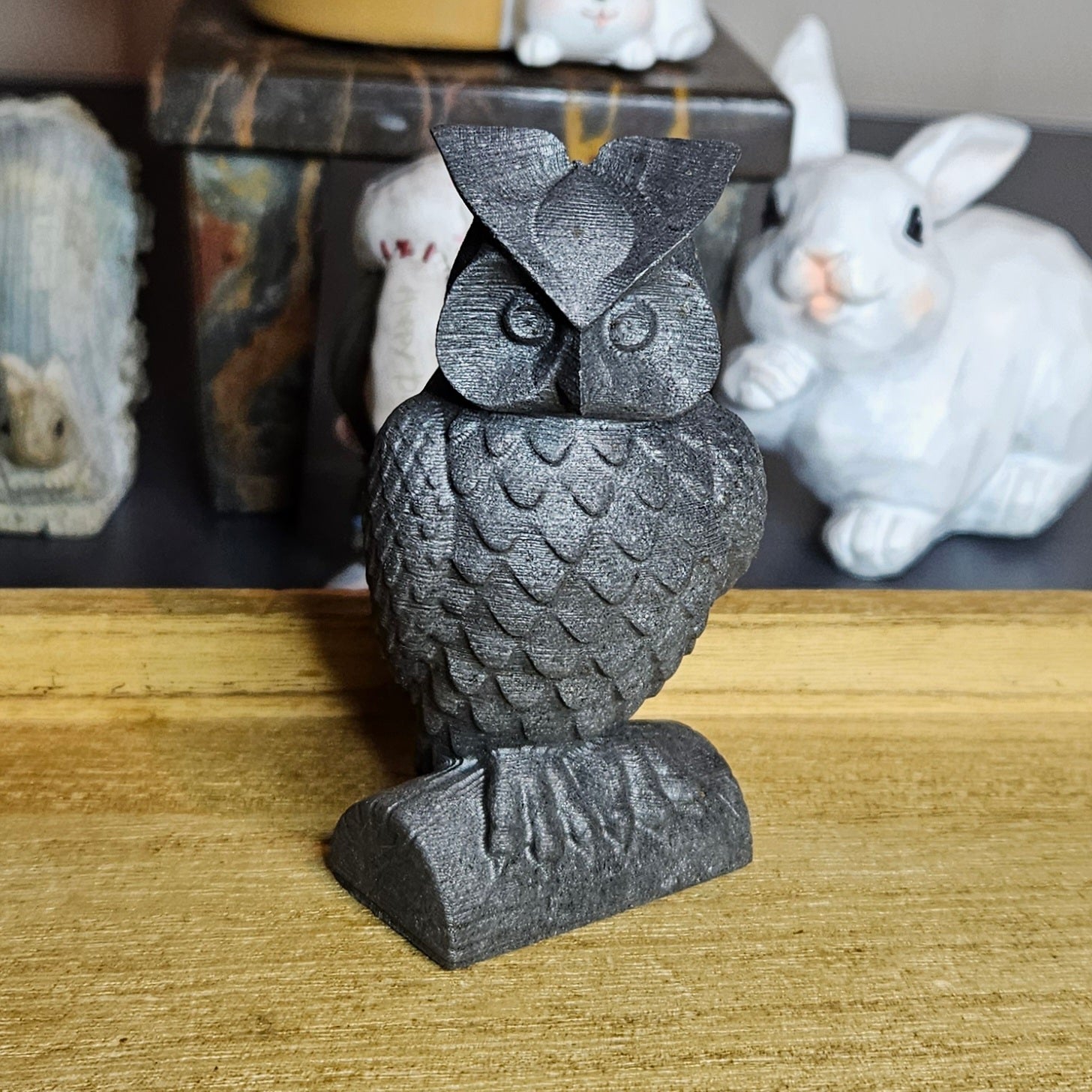 This Shungite Owl Carving features a beautifully detailed owl perched upon a log, crafted from natural Shungite stone. The non-polished finish enhances the raw beauty of the piece, making it a unique addition to any collection. Embrace the protective and healing properties of Shungite with this charming owl carving.