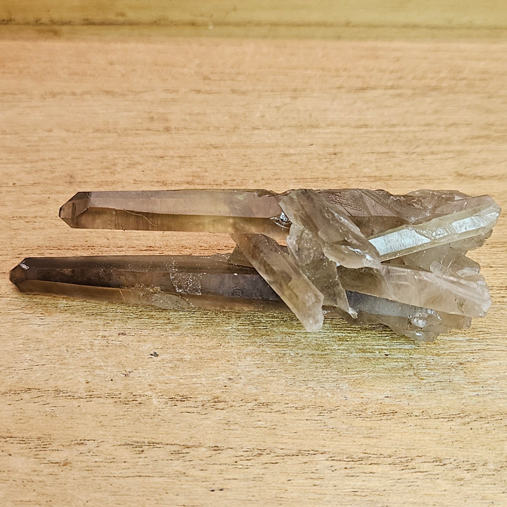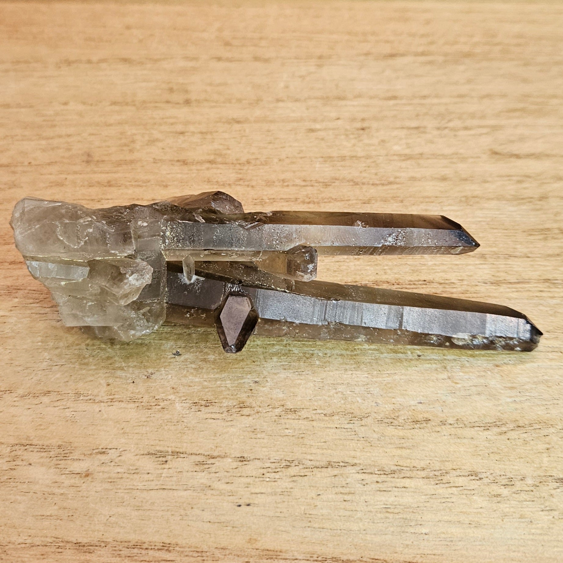 This smokey quartz cluster is a stunning addition to any crystal collection. With its unique double point formation and deep, rich color, it adds a touch of elegance and grounding energy to any space. Smoky Quartz is a brown/gray variety of quartz colored by natural radiation activating aluminum impurities.