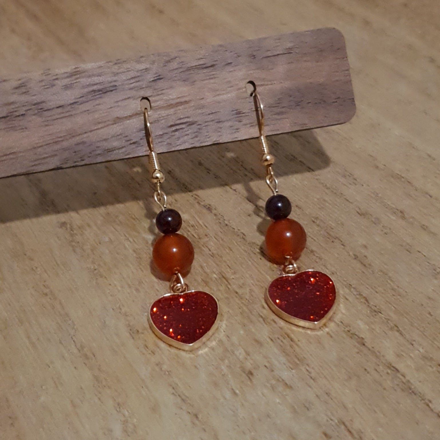 Celebrate love with our Sparkling Red Heart Earrings! Handcrafted with glittery red heart charms and adorned with vibrant carnelian and red garnet beads, these charming earrings are perfect for Valentine's Day and beyond. The gold colored earring hooks add a touch of elegance to this heartfelt accessory and perfectly complement the gold colored charms.
