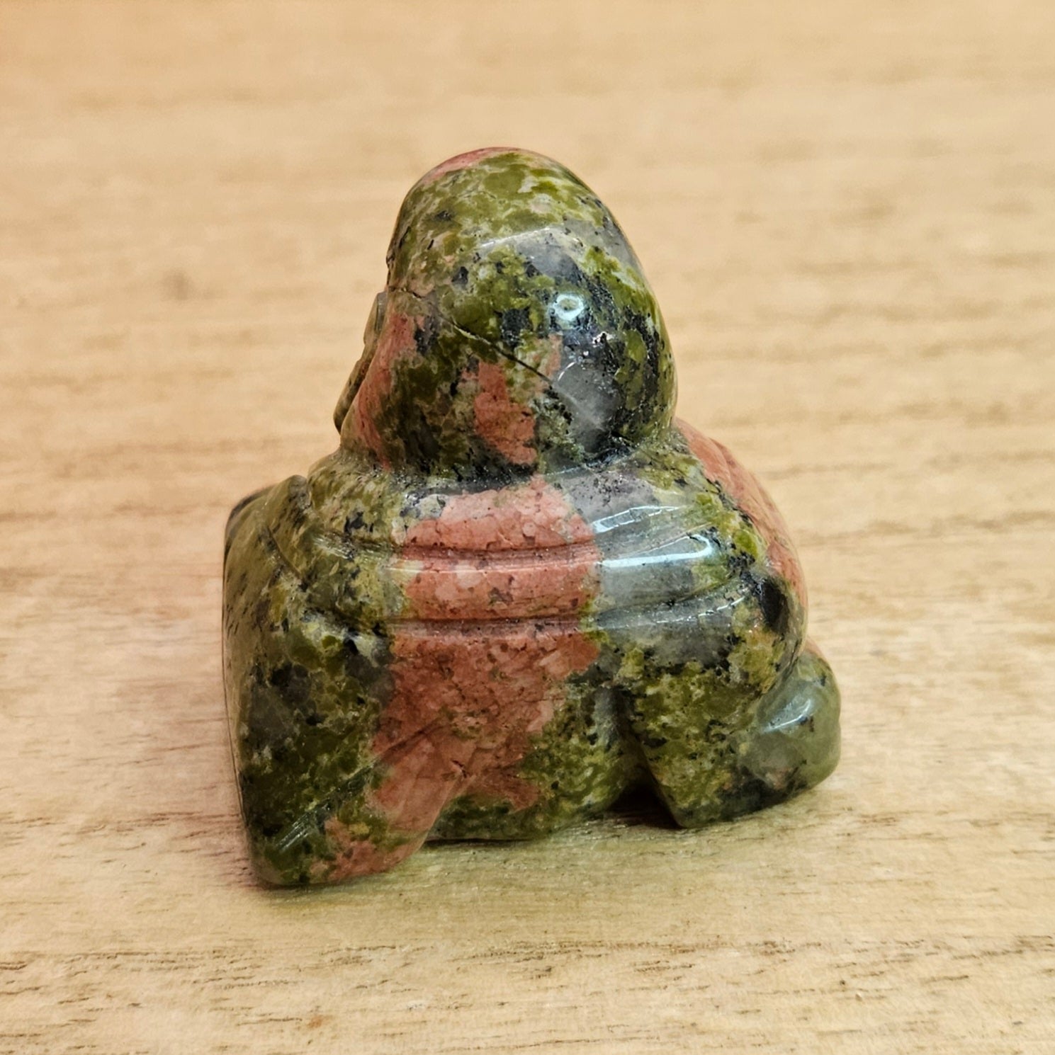 Bring joy and good luck into your life with our Unakite Laughing Buddha carving. Made from beautiful pink and green Unakite stone, this happy guy will fill your space with positive energy. A perfect addition to any home or office space.