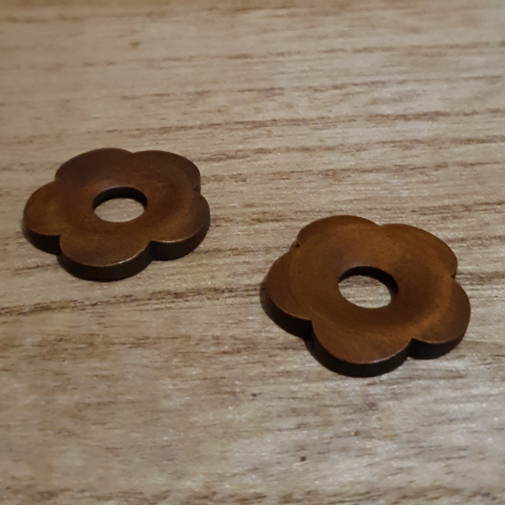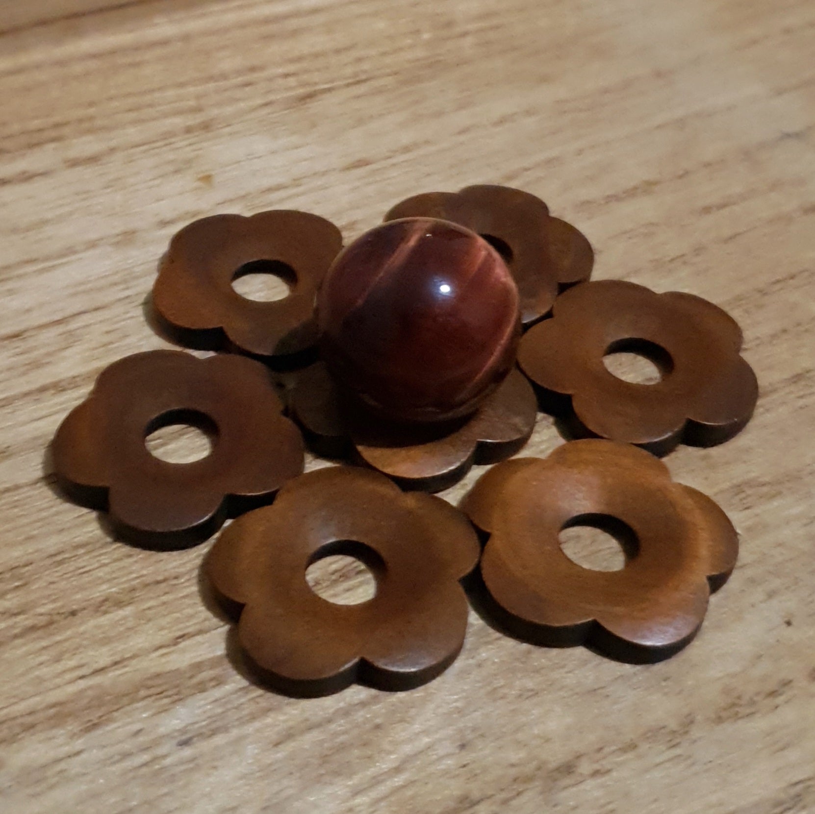 Beautiful little flower shaped sphere holders made of varnished cherry wood. Able to hold an array of different sized spheres. A cute simple addition to any collection.