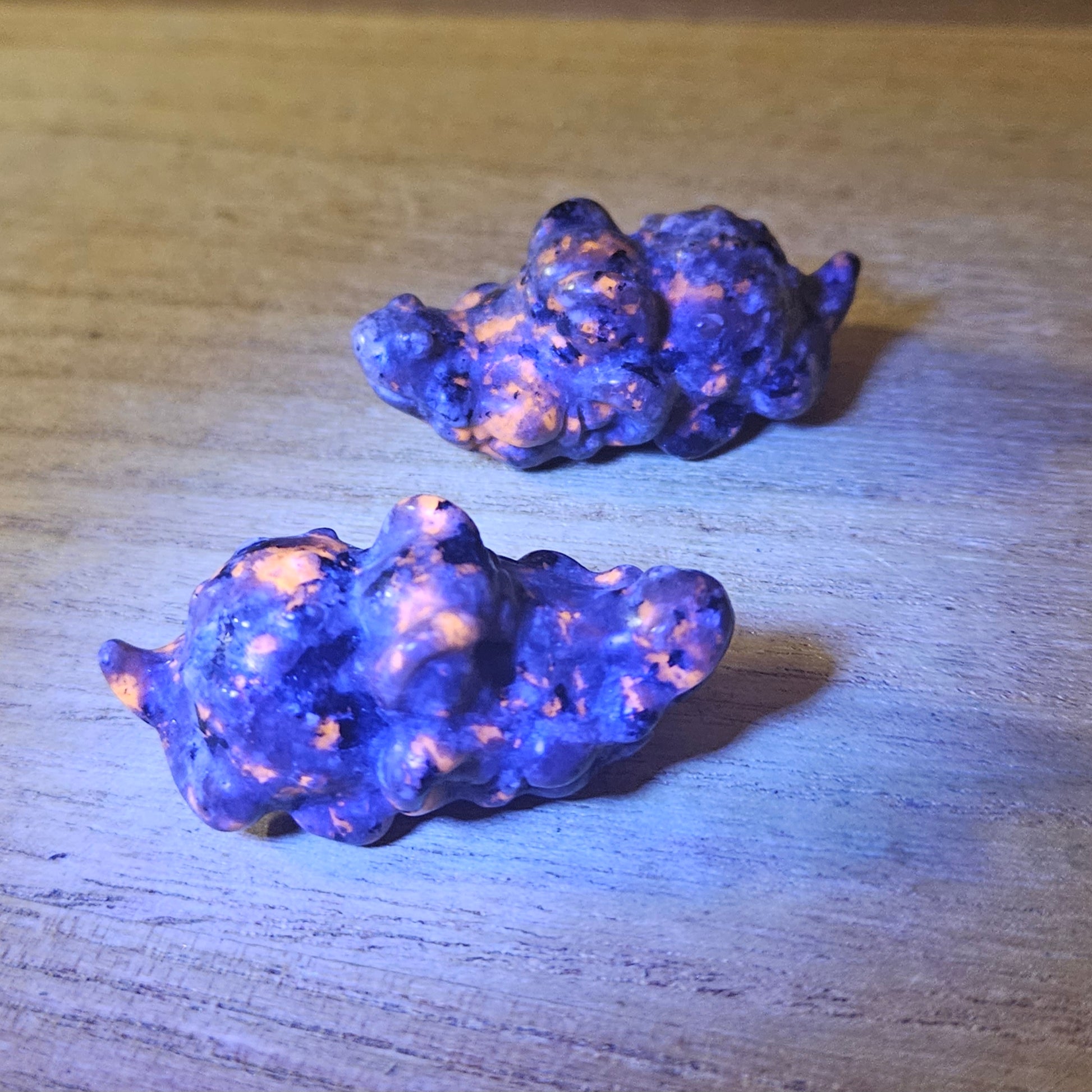 Crafted from Yooperlite stone, this cute little crocodile figurine is a unique addition to any collection. The uv reactive material gives it a mesmerizing glow under a blacklight. Bring a touch of nature and fun to your home with this cute little snappy guy! Yooperlite is a type of fluorescent rock found in Michigan’s Upper Peninsula. When you hold a yooperlite crystal, it may appear as an ordinary grayish-brown rock. However, when you expose it to UV light, something magical happens. The yooperlite crystal glows with a vibrant orange spots of color.