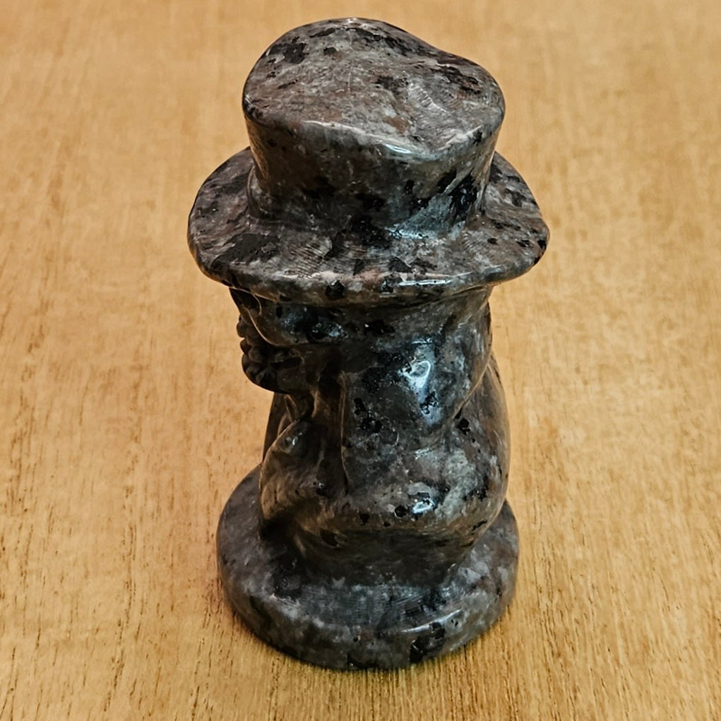 This Yooperlite Skull Man Carving is sure to add a unique touch to any collection. Crafted from Yooperlite, its UV reaction creates a stunning orange glow. The intricate carving of a skeleton man in a top hat makes it a cool and captivating piece.
